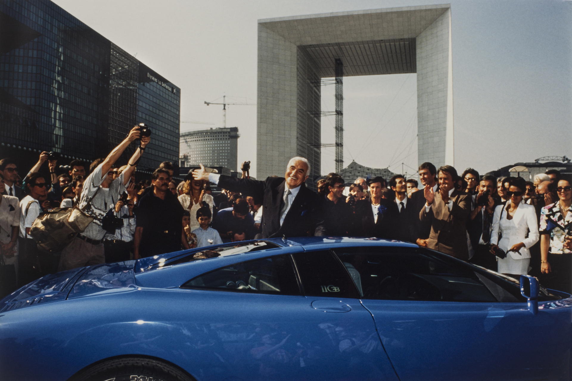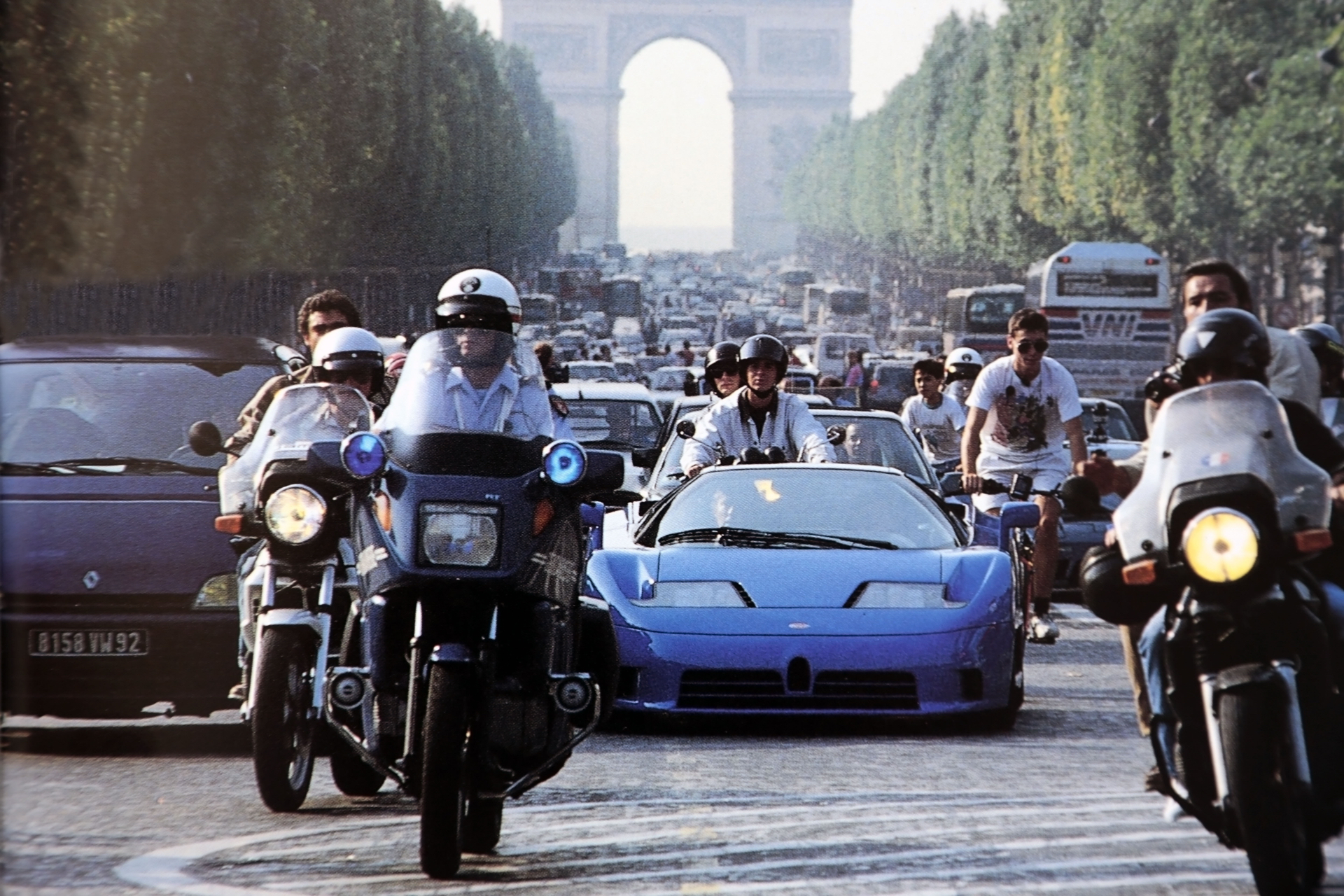 Rok później, 15 września 1991, w 110. rocznicę urodzin Ettore Bugattiego, świat ujrzał nowy supersamochód – Bugatti EB110. Trzy egzemplarze przejechały wówczas słynnymi Polami Elizejskimi w Paryżu. EB oznaczało Ettore Bugatti, a liczba 110 – jego jubileusz. Samochód zachwycał: silnik V12 o pojemności 3,5 litra, pięć zaworów na cylinder, cztery turbosprężarki, stały napęd na cztery koła, sześciobiegowa skrzynia i moc od 560 do 610 KM. Karbonowy monokok czynił go absolutnym ewenementem. EB110 przyspieszał do 100 km/h w 3,3 sekundy, osiągał 351 km/h i przez lata pozostawał najszybszym seryjnym samochodem świata. Ustanowił też cztery rekordy świata – w przyspieszeniu, prędkości maksymalnej na benzynie, na lodzie i w kategorii aut produkcyjnych.