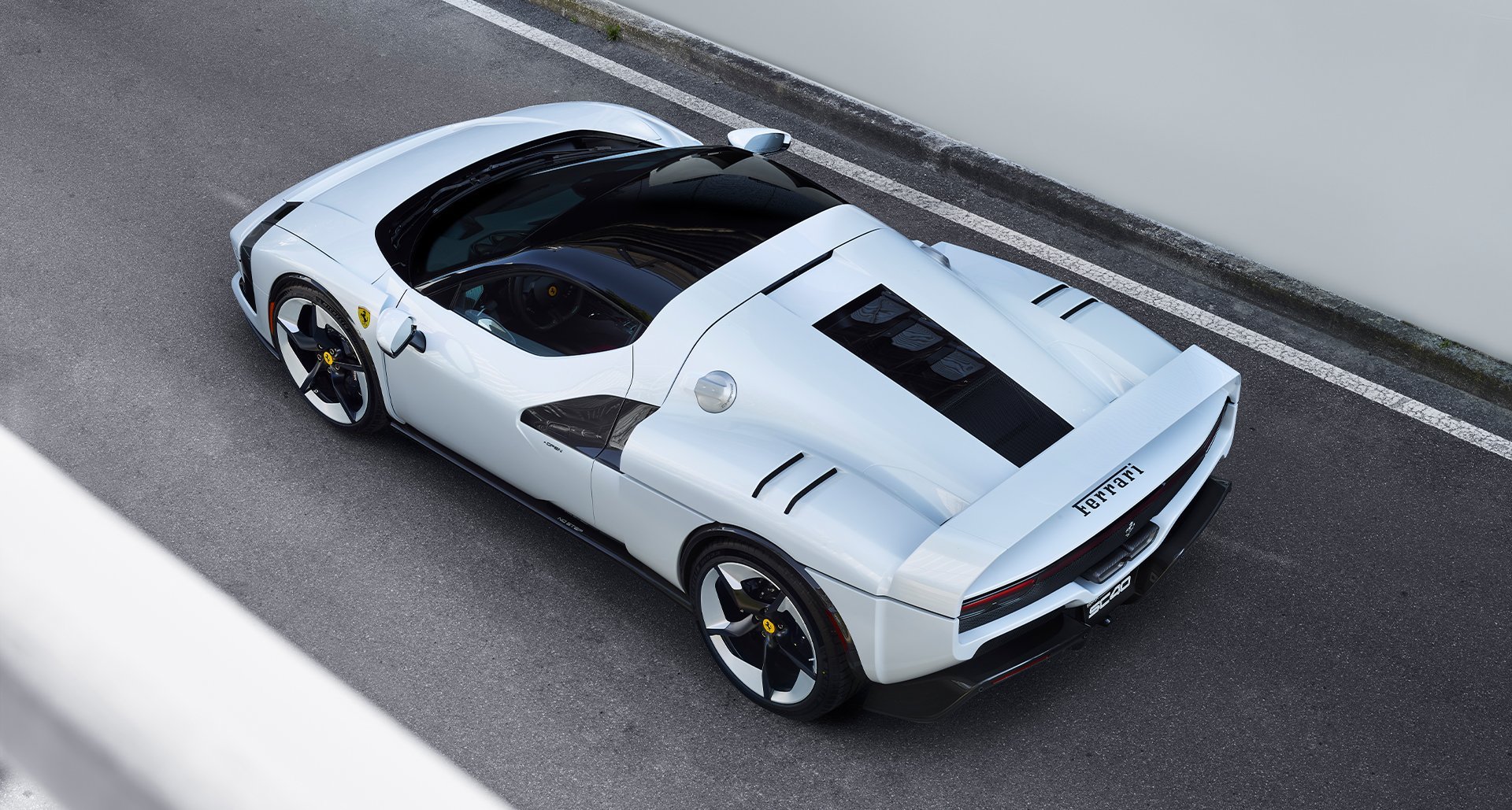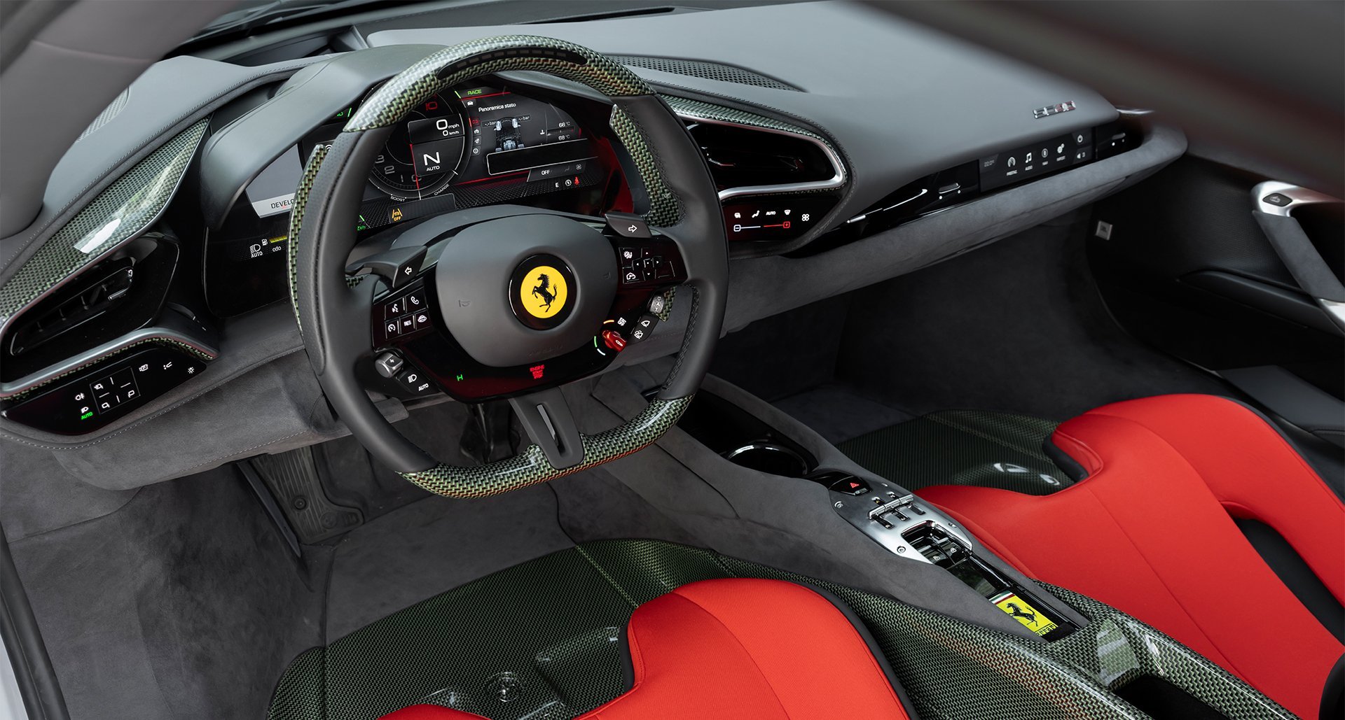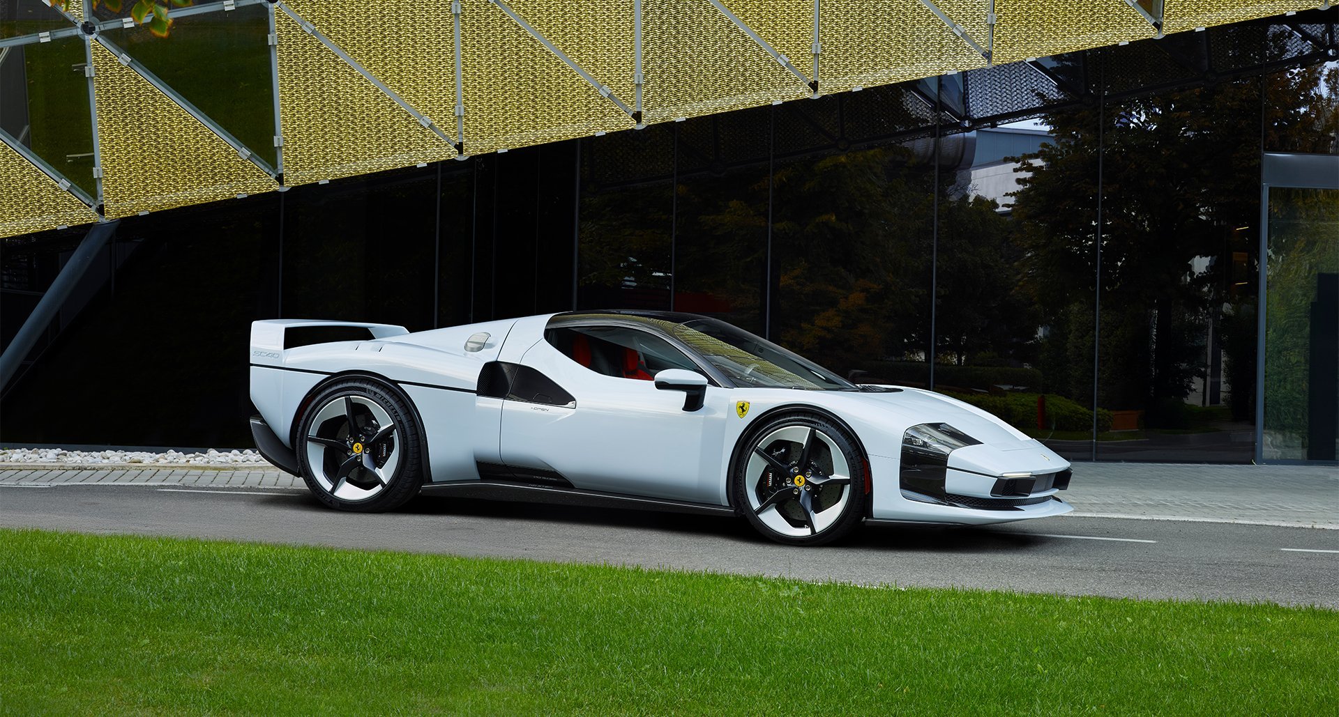 Długi, niski przód kontrastuje z krótkim tylnym zwisem i stałym, wysokim skrzydłem, które płynnie łączy się z nadwoziem poprzez czarną linię podziału. Tylny pas wyróżniają otwarte elementy z siatki, odsłaniające mechaniczne detale, a przyciemniane żaluzje z Lexanu ujawniają hybrydowy silnik V6 i poprawiają przepływ powietrza. Centralny układ wydechowy z tytanowymi z karbonowymi końcówkami dopełnia wyglądu, a po jego bokach znajdują się światła tylne inspirowane modelem 296 GTB.