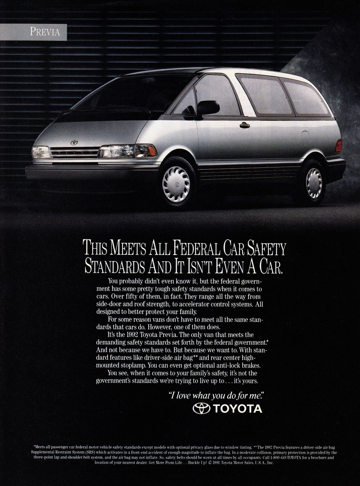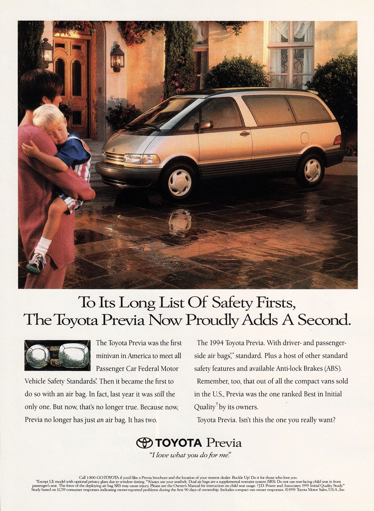 Japończycy, zamiast zbudować kolejne nudne, pudełkowate auto dostawcze z rzędem siedzeń, zaserwowali nam na początku lat 90-tych „statek kosmiczny”. Model ten nazywany był rożnie, najbardziej znana nazwa to Previa, jednak w Japonii była sprzedawana jako Estima (niektóre wersje różniły stylistyka), a w Australii jako Tarago. Nazwa „Previa” wywodzi się z hiszpańskiego słowa oznaczającego „zapowiedź”, ponieważ Toyota postrzegała pierwszą Previę jako pojazd, który będzie zapowiedzią technologii stosowanych w przyszłych minivanach. I rzeczywiście, patrząc na prototyp zaprezentowany podczas 28. Tokio Motor Show w 1989 roku tak było. Projektanci Tokuo Fukuichi oraz Amerykanin David Doyle z Calty Design Research przewidzieli, że lata 90-te bedą należeć do obłości i minivanów. Pierwsza generacja Previi zerwała z kanciastą stylistyką lat 80., organiczne linie, które do dziś wyglądają świeżo i niezwykle aerodynamicznie.