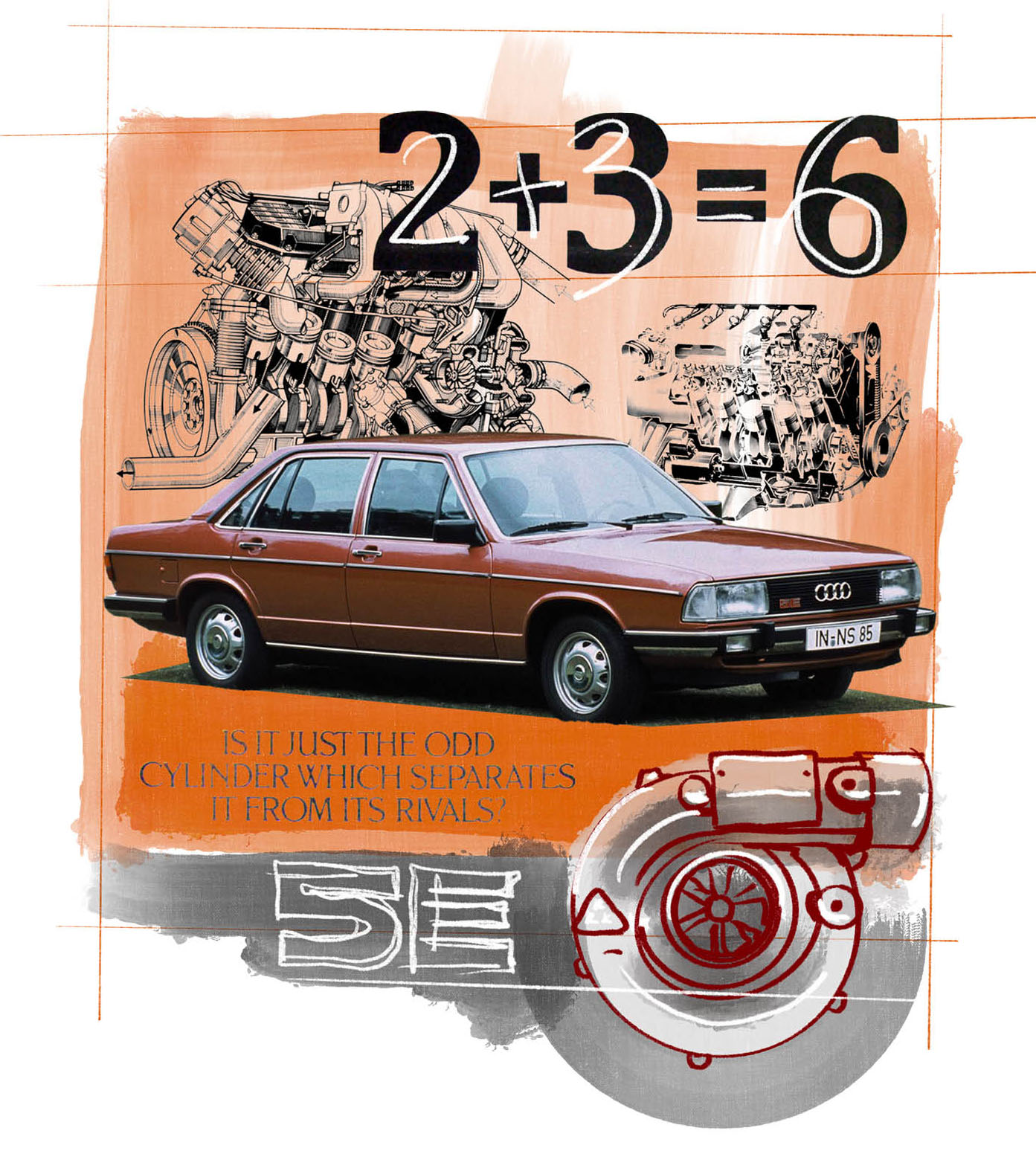 Wróćmy jednak do Audi i jego 5-cylindrowego silnika. Projekt ukończono w 1976 r., był zatem gotowy do użytku w roku modelowym 1977. Zgodnie z założeniami motor EA828 zadebiutował w Audi 100, a wyposażona w niego wersja została dodatkowo oznaczona symbolem „5E”. Nie licząc kilku eksperymentów z przeszłości, jednostka ta została pierwszym benzynowym silnikiem z pięcioma cylindrami zastosowanym seryjnie w samochodzie osobowym. Benzynowym, ponieważ wcześniej pod szyldem Mercedesa skonstruowano już wspomnianego 5-cylindrowego diesla. Pierwsza wersja EA828 miała 2,1 l pojemności skokowej, z której wykrzesano moc 136 KM. Tłoki w silnikach z parzystą liczbą cylindrów pracują parami, tak że drugi stanowi przeciwwagę dla pierwszego. W motorze z pięcioma cylindrami jeden tłok pozostaje bez pary, czego wynikiem jest specyficzna kolejność zapłonu w układzie 1-2-4-5-3. Coś, co pozornie mogło być wadą, stało się jednym z najważniejszych znaków rozpoznawczych 5-cylindrowych jednostek napędowych – ich charakterystyczny dźwięk, trudny do opisania słowami.