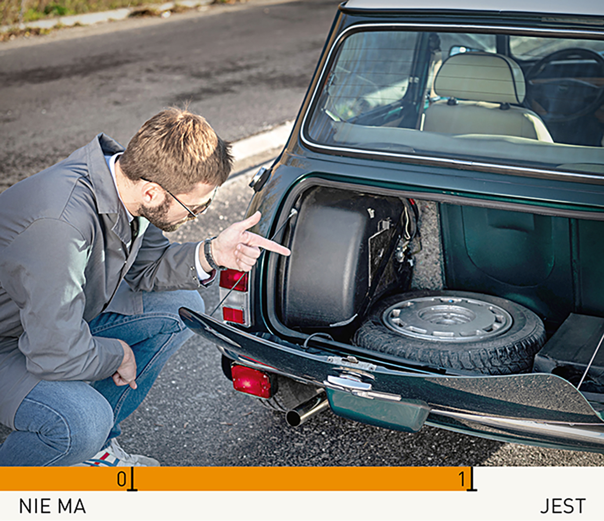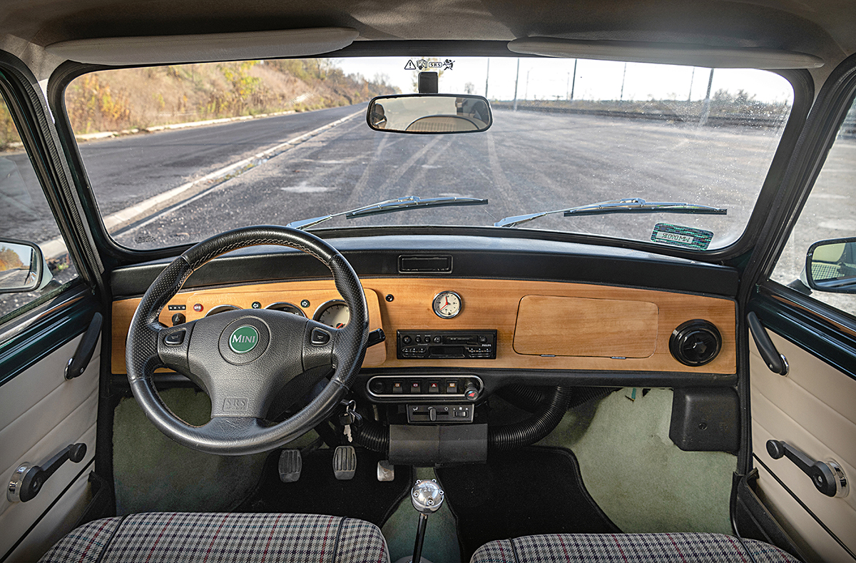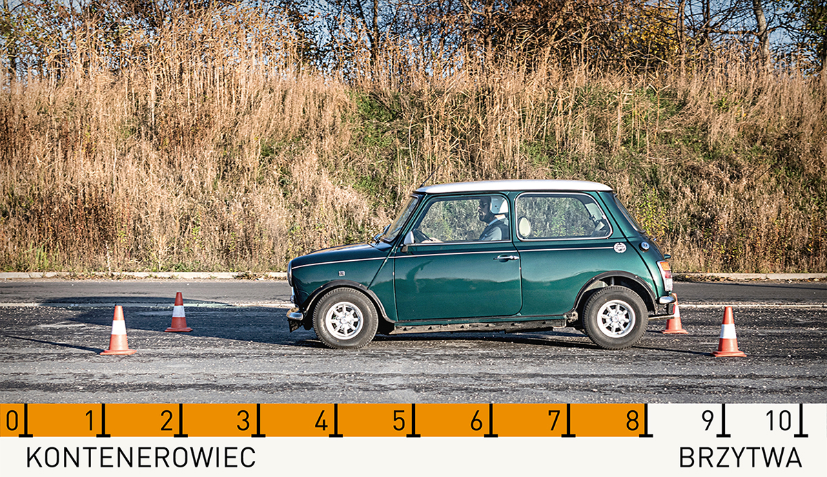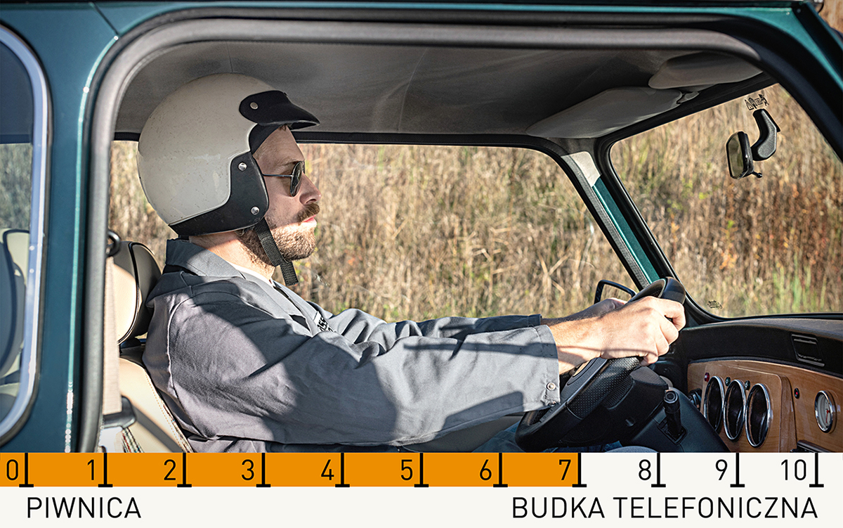 Poprawek w Mini, które uczyniły z niego poważny samochód dla poważnych ludzi, jest o wiele więcej. W drzwiach zamiast kawałka linki zaczęły pojawiać się prawdziwe klamki. Fotele są już fotelami, a nie ogrodowymi leżankami. Szyba w drzwiach jest jednoczęściowa i opuszcza się korbką, a nie odsuwa jak w przeszklonej meblościance. Tablica przyrządów próbuje coś przekazać szoferowi, a kierownica przytyła i zawiera nawet poduszkę powietrzną. Jedyne, co nie uległo zmianie przez wszystkie lata, to objętość kabiny. Nie jest jak w Maluchu, gdzie dźwignia zmiany biegów wbija mi się w zgięcie pod kolanem, a obicie drzwi zdziera skórę z łokcia. Tutaj jest po prostu minimalistycznie. Ale co innego siedzieć samemu, a co innego ze współpasażerem, który w Mini będzie czuł się jak para butów w kartonowym opakowaniu. Miejsca wszerz jest niewiele, chociaż doceniam całkiem sporą rezerwę nad głową. Natomiast w kabinie jest nieco chaotycznie. Różne elementy sprawiają wrażenie, jakby pochodziły z innych samochodów. Tablica przyrządów wygląda na obitą boazerią, z wyciętą brzeszczotem klapką schowka i otworem na radioodtwarzacz. Mały zegarek ulokowano w miejscu wielkiego prędkościomierza. Ten wraz z obrotomierzem trafił za kierownicę, czyli w ergonomicznie prawidłowe miejsce. Natomiast wolant pasuje do tego towarzystwa jak przysłowiowa ryba do roweru. Kierownica wygląda… zbyt nowocześnie, jakby pochodziła z bardziej obudowanego plastikiem kokpitu o wiele nowszego auta. Jest także ustawiona pod dużym skosem, jak w jakimś dostawczaku.