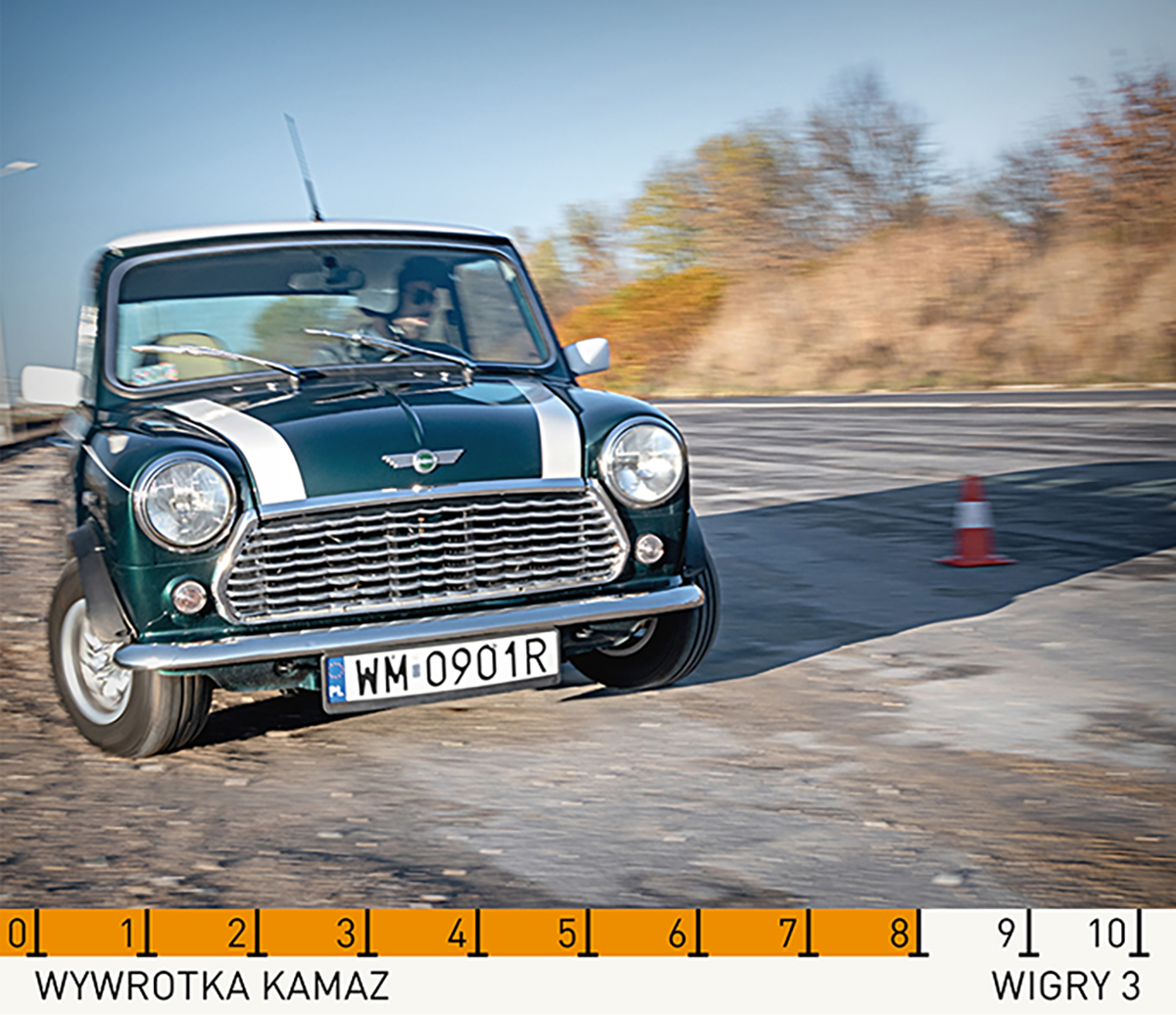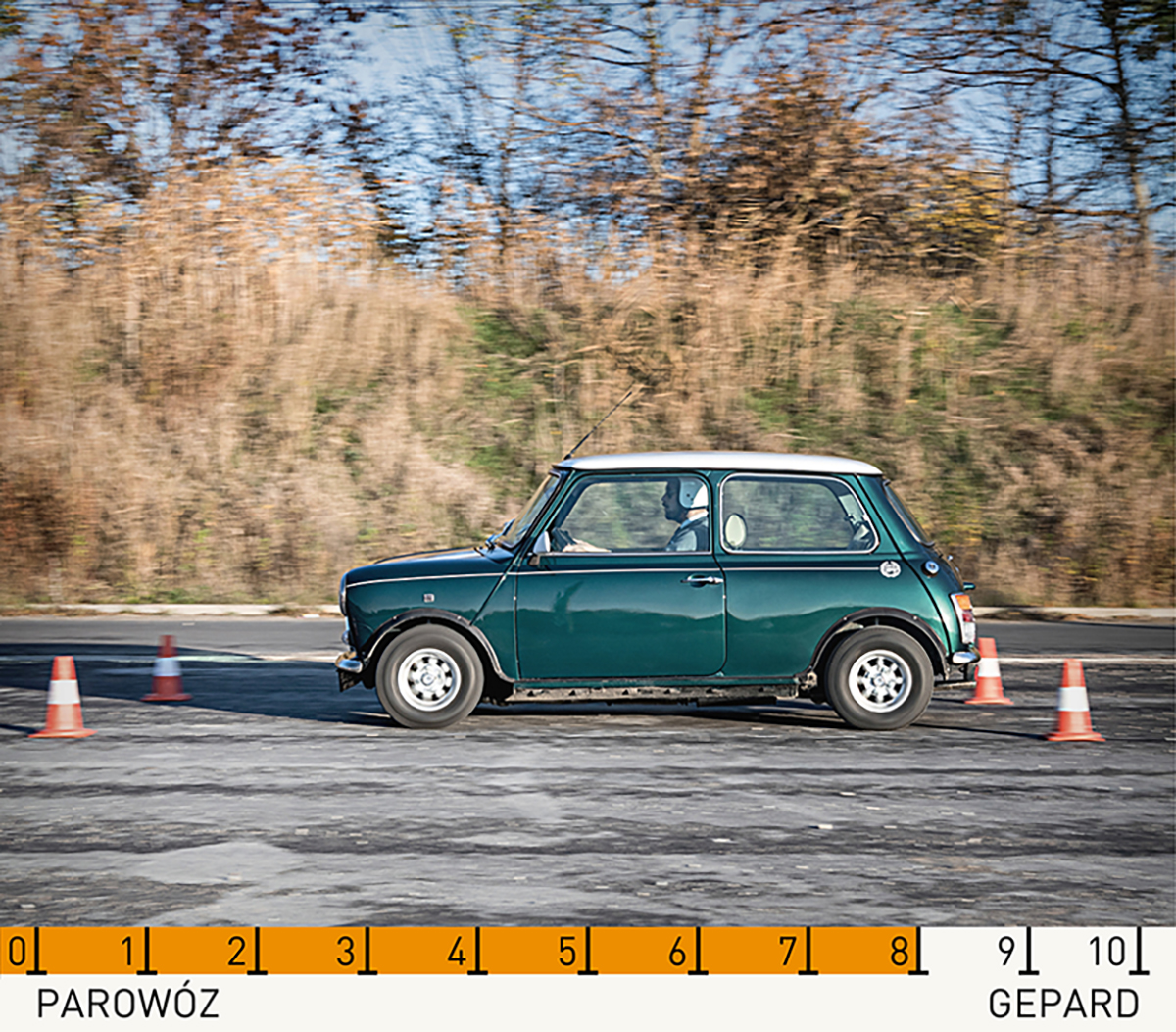 „Gokartowa” jest także perspektywa drogi, głównie ze względu na widok zza kierownicy na jeżdżące wokół SUV-y. Twardo zestrojone zawieszenie wzmacnia pewność na szosie, bo auto nie przechyla się idiotycznie na każdym zakręcie, tylko cały czas, dosłownie i w przenośni, trzyma poziom. To w dużym stopniu zasługa specyficznego zawieszenia na gumowych odbojach, które stają się tym twardsze, im bardziej ugina się nadwozie. Warto też pamiętać, że nasze Mini nie ma już malutkiego silniczka o pojemności 848 cm³, tylko sensowny motor 1275 cm³. Zachwiało to wyważeniem, acz przy takiej niewielkiej masie potrafi to samo spowodować siedząca na zderzaku mucha. Niemniej dzięki temu silnik nieco lepiej dociąża przednią oś. Ma też trochę więcej koników, niż pierwowzór, bo około dwukrotnie.