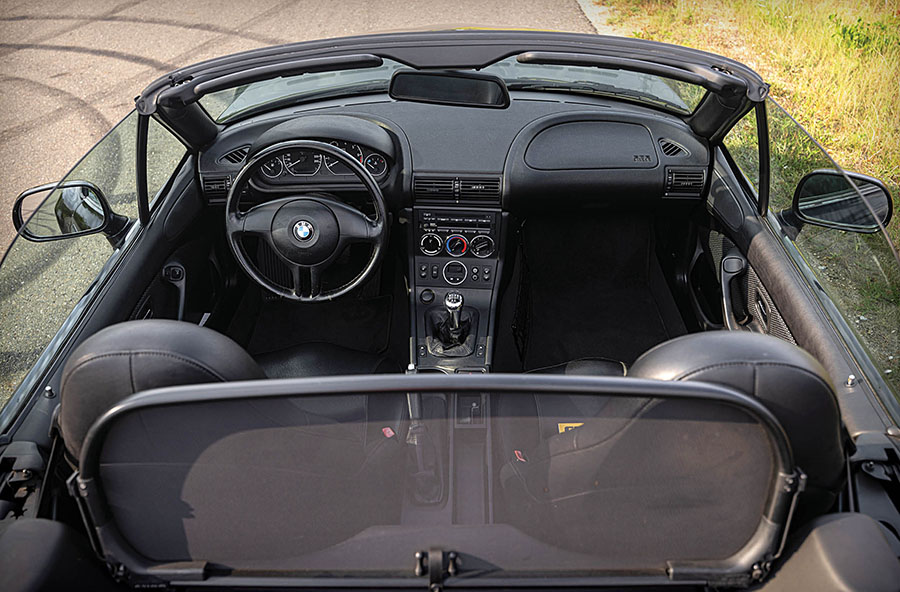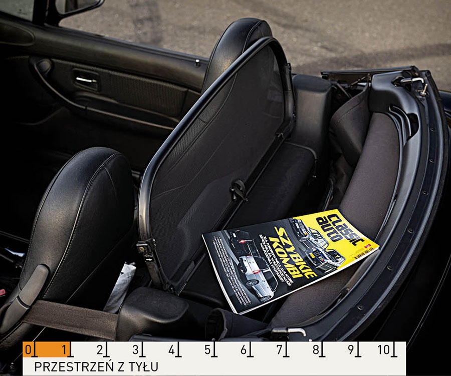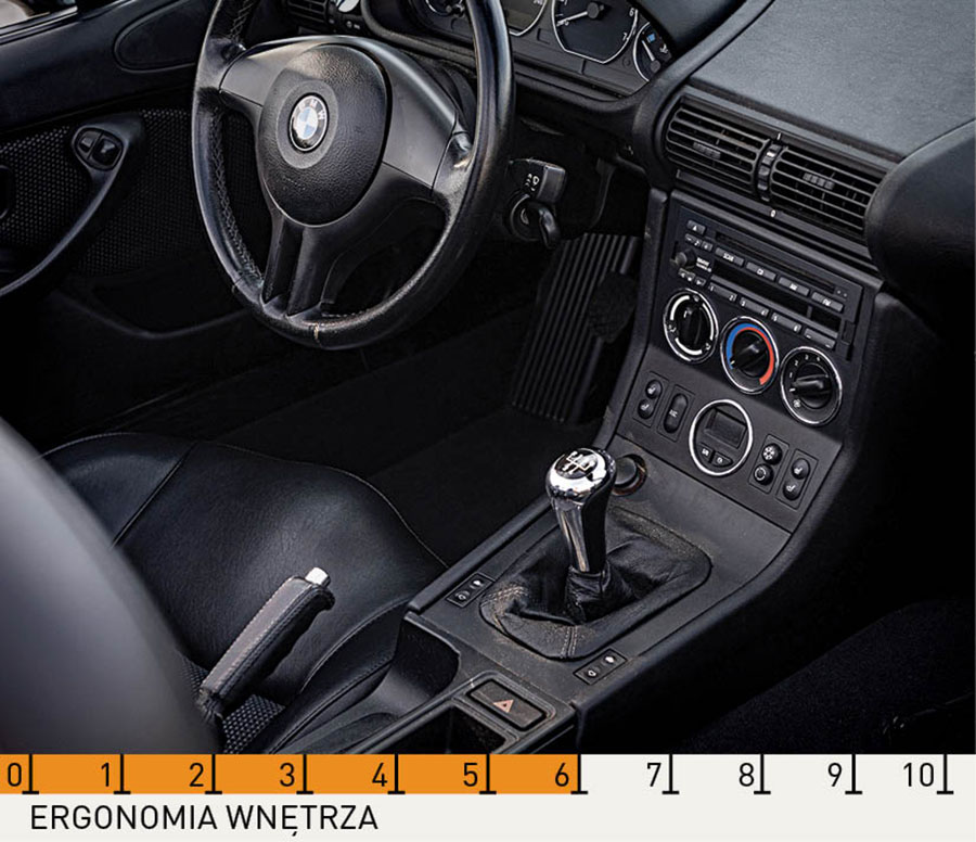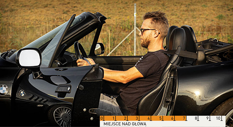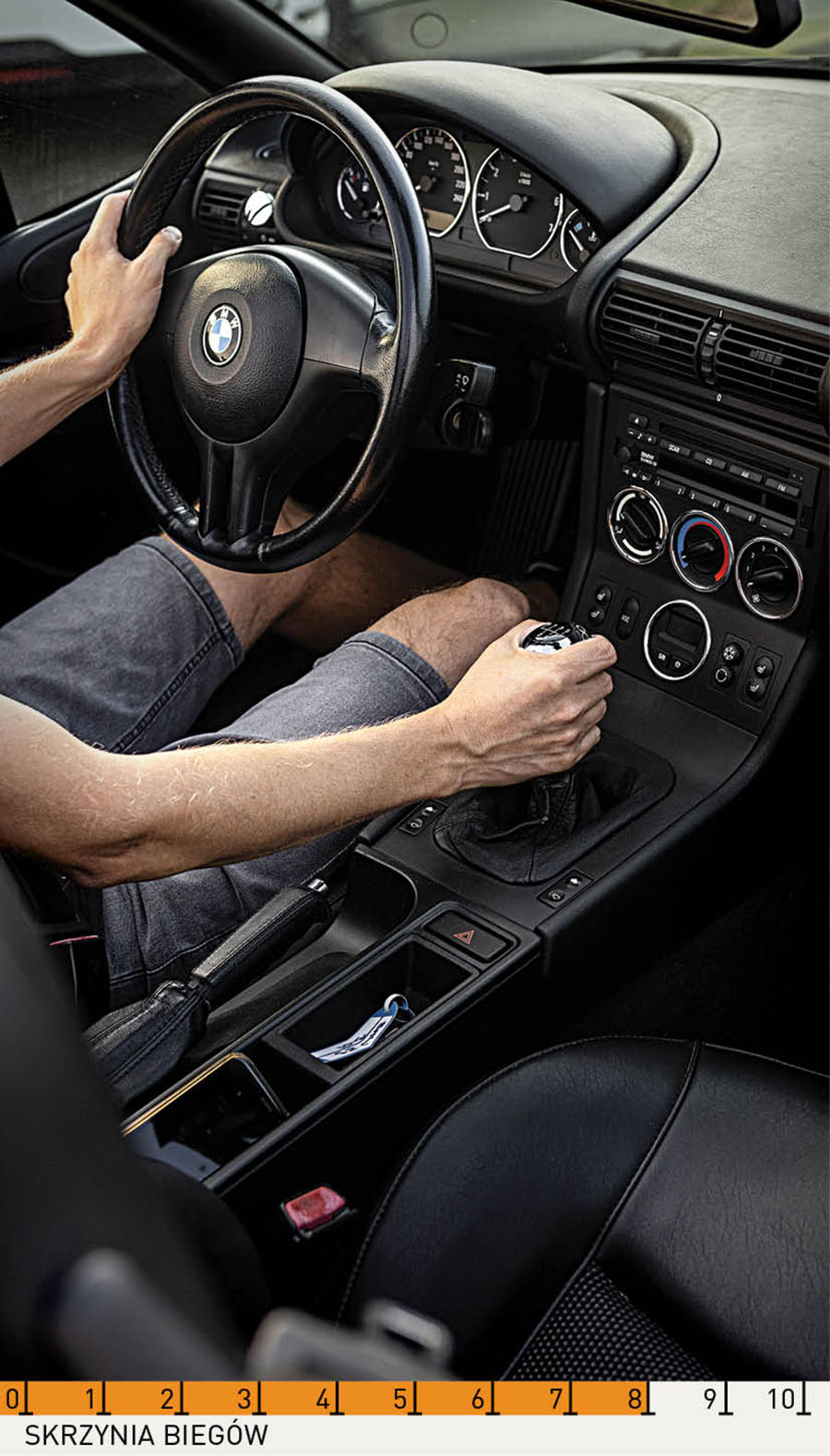Po tak czarującym pierwszym wrażeniu w miarę pokonywania dalszych kilometrów widzę jednak pewne niedociągnięcia w prowadzeniu Z3. Wychodzą na jaw szczegóły wskazujące na to, że nie była to konstrukcja opracowana od podstaw. Przede wszystkim czuć w niej ograniczoną sztywność nadwozia, co można uznać za trwający przez całe dekady standard w segmencie roadsterów, ale akurat Z4, bezpośrednio następujące po Z3, odznaczało się znacznym progresem na tym polu (sam producent oceniał poprawę sztywności skrętnej aż o 70% pomiędzy tymi generacjami). Tylne zawieszenie ze względu na prostą budowę lubi głęboko przykucnąć po mocnym wciśnięciu gazu. To tylko jeden z licznych czynników, przez które jazda Z3 z wysokimi prędkościami może być z lekka przerażająca. O ile kompaktowe wymiary rozbudzają wyobraźnię, co się stanie, jeśli coś pójdzie nie tak, o tyle czerpanie z pełnych możliwości liczącego ćwierć wieku roadstera najskuteczniej ogranicza myśl o ewentualnej dekapitacji – w tym konkretnym egzemplarzu za głową kierowcy nie ma żadnego wzmocnienia chroniącego przed dachowaniem. Zaufania nie budzi też samo wnętrze, gdyż sprawia wrażenie, jakby było zbieraniną różnych części i pomysłów z innych modeli BMW, co zresztą jest prawdą. W oczy rzuca się specyficznie rozumiana przez BMW ergonomia. Przyciski do sterowania szybami znajdują się na tunelu środkowym, a te służące do operowania dachem umieszczono w chyba najbardziej kuriozalnym miejscu, które można sobie wyobrazić, czyli… za prawym łokciem kierowcy. Otwarcie dachu wymaga tutaj kręgosłupa skrętnego w osi pionowej o ponad 90 stopni.