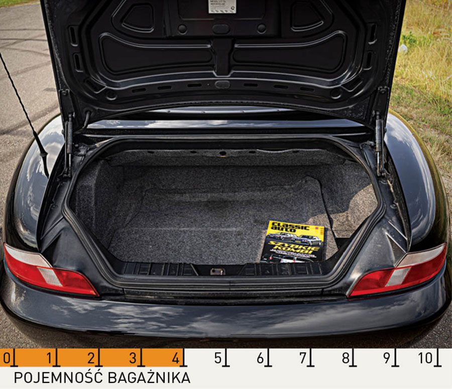 Jak na ten typ auta i obecność składanego dachu pojemność bagażnika... i tak okazuje się mizerna. Kufer jest płytki, gdyż pod nim znajduje się akumulator.