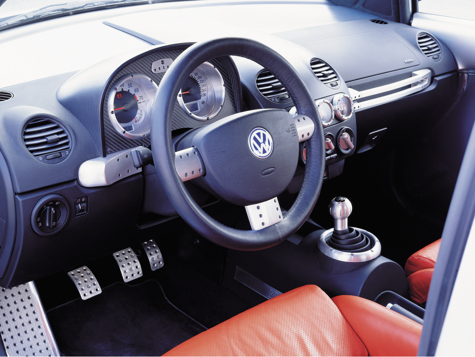 Wnętrze Beetle RSi przyciąga wzrok pomarańczową skórzaną tapicerką kontrastującą z aluminiowymi akcentami. Przednie fotele to kultowe kubełki Recaro, a elementy takie jak panele drzwi, deska rozdzielcza czy konsola środkowa zostały wykończone włóknem węglowym. To nie tylko efektowny detal, lecz także rozwiązanie, które pozwoliło obniżyć masę pojazdu.