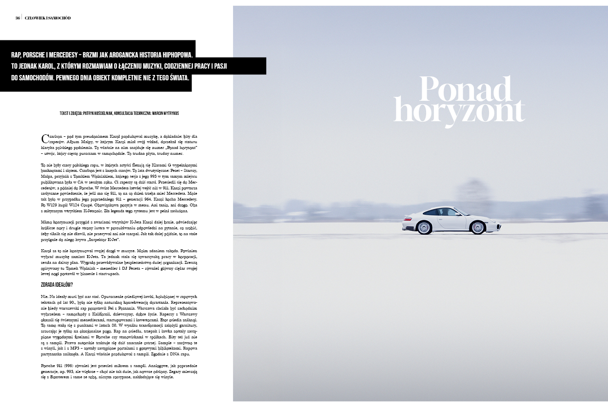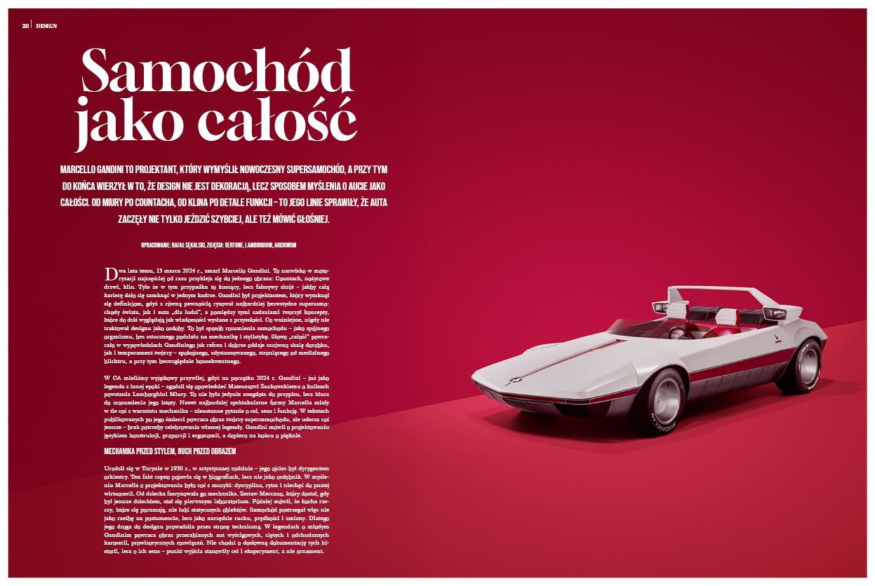 Z tematyką zmiany naturalnie koresponduje dział „Design” i postać Marcella Gandiniego – projektanta, który nigdy nie bał się ryzyka. Jego prace pokazują, że prawdziwa innowacja niemal zawsze budzi kontrowersje, a czas bywa najlepszym sędzią odwagi. Gandini udowodnił, że forma potrafi wyprzedzać epokę i że rewolucje wizualne potrzebują lat, by zostać w pełni zrozumiane. W cyklu „Człowiek i samochód” schodzimy na bardziej osobisty poziom. Porsche 996 Czarlsona to historia relacji, nie specyfikacji. Opowieść o tym, jak samochód staje się częścią biografii właściciela, a nie tylko przedmiotem.