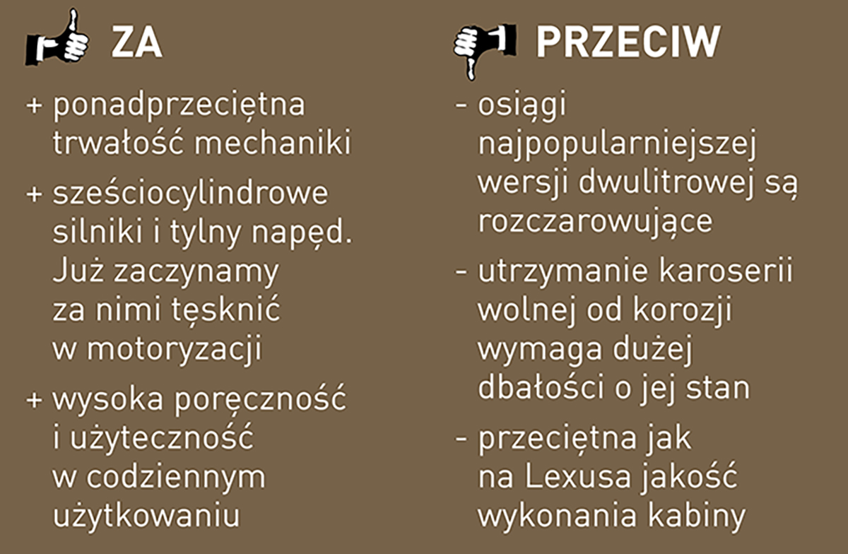 W stronę układu jezdnego IS-a płyną same dobre słowa. Auto świetnie łączy precyzję prowadzenia z przyjemną sprężystością pokonywania nierówności. Praca zawieszenia jest też dobrze wyciszona. Zużycie elementów wynika z wieku i przebiegu, a nie z jakichś typowych przypadłości. Należy zwrócić uwagę na stan dolnych sworzni wahacza. Jeżeli wymagają wymiany, należy natychmiast to uczynić. Zignorowanie usterki może doprowadzić do odpadnięcia koła w trakcie jazdy.