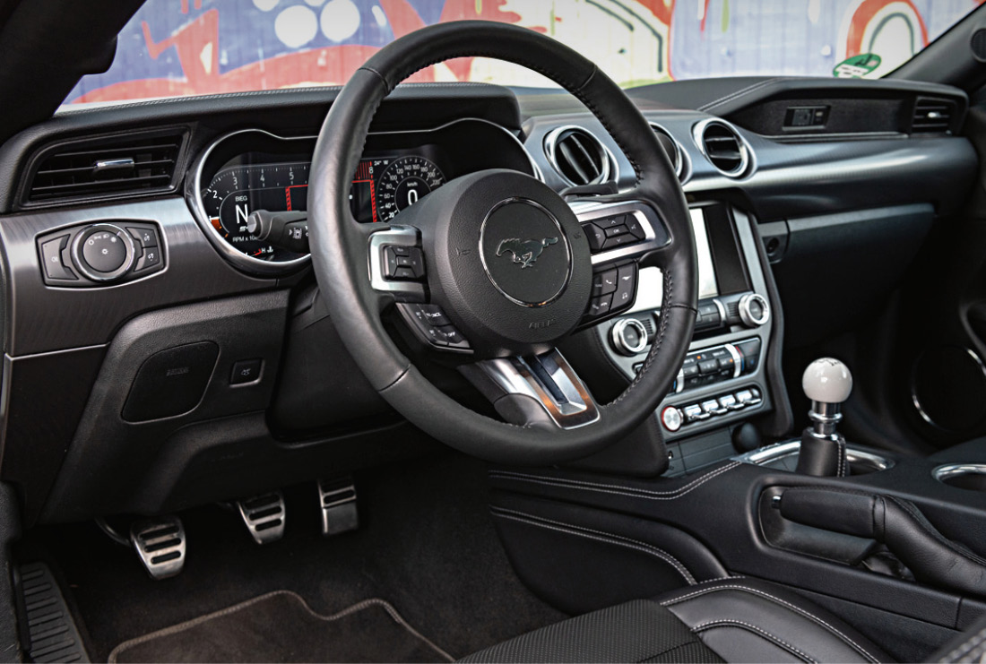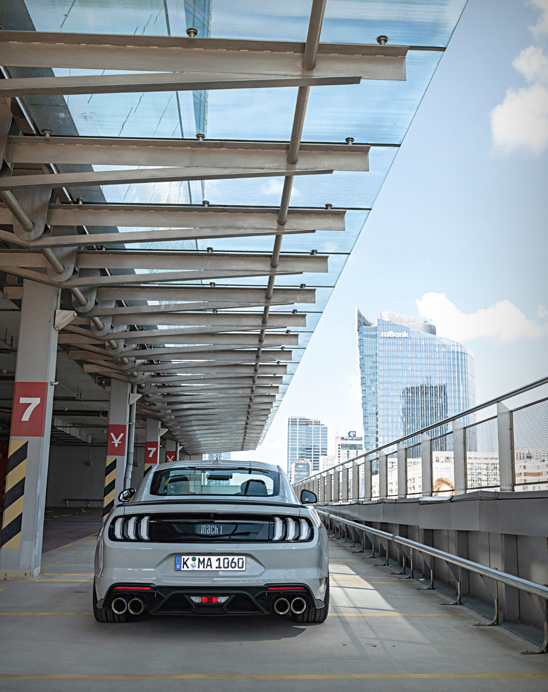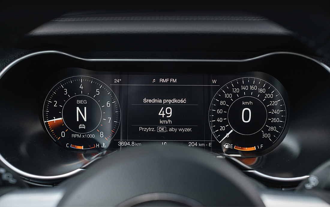 Jaskrawy lakier w kolorze Fighter Jet Grey i słuszne wymiary testowanego Mustanga niczym magnes przyciągają wzrok przechodniów. Z zewnątrz nawiązania do pierwowzoru widać od razu: matowa naklejka na masce w kształcie tzw. „shaker hood”, wloty powietrza oraz tylny spoiler to tylko niektóre z nich. W środku znalazły się sportowe fotele Recaro, nie zabrakło także zaawansowanych multimediów, wyświetlaczy i porządnego audio sygnowanego przez Bang & Olufsen. Mówiąc krótko, niczego nie brakuje. Za napędzanie tego rasowego wierzchowca odpowiada 5-litrowa jednostka V8 o mocy 460 KM znana z wersji specjalnej Bullitt, która potrafi rozpędzić Mustanga do 267 km/h! Maksymalny moment obrotowy, który wynosi aż 569 Nm, jest osiągany przy 4600 obr/min. Silnik zestrojono z sześciobiegową ręczną skrzynią Tremec z dwutarczowym sprzęgłem. Jest słusznie uważana za jedną z najlepszych tego typu konstrukcji na świecie. Jej wybierak działa ciasno i bardzo precyzyjnie. Dla tych, którzy zawsze chcą mieć dwie ręce na kierownicy, Ford zaproponował 10-stopniowy automat, którym można zastąpić klasyczny lewarek. W zależności od wybranej skrzyni sprint do „setki” wynosi odpowiednio 4,4 lub 4,8 sekundy. Mach 1 oferuje także wybór różnych trybów jazdy. Obok standardowego znajdziemy też Sport i Track, a ten ostatni wzbogacono jeszcze o funkcje Track Apps. Pozwalają one na korzystanie z akcelerometru i liczników przyspieszenia, a także uruchamiają procedurę startu oraz umożliwiają… palenie gumy. Zawieszenie pracuje dość sztywno, ale to cena, jaką płaci się za szybsze i pewniejsze pokonywanie ciasnych zakrętów oraz przeznaczenie, które inżynierowie przypisali tej wersji. W nowym dziecku Forda nawet najmniejszą niewygodę rekompensują wspaniałe dźwięki tradycyjnego silnika, tak rzadko spotykanego w nowych samochodach.