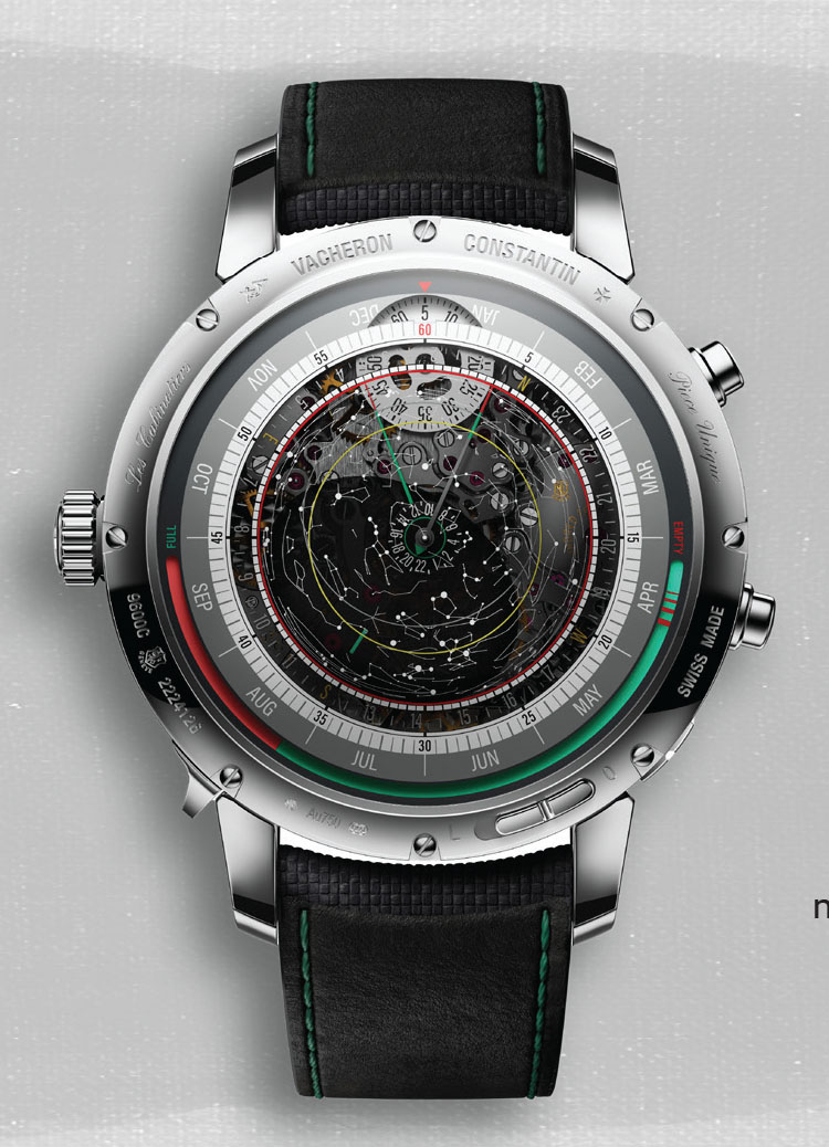 Na froncie dominują dwie centralne wskazówki – godzinowa i minutowa – oraz cztery subtarcze. U góry znalazł się wieczny kalendarz – prezentuje dzień, miesiąc, nazwę dnia tygodnia, numer tygodnia oraz bieżący rok. Po prawej znajduje się drugie wskazanie czasu, umożliwiające wybór strefy czasowej z pomocą nazw miast. Po lewej – precyzyjny kalendarz księżycowy z realistyczną fazą Księżyca, zaprojektowany z dokładnością na 122 lata. Poniżej wykres pływów. Dolna część tarczy prezentuje równanie czasu, znak zodiaku, wysokość Słońca nad horyzontem i moment lokalnego południa słonecznego. Na krawędzi widnieją informacje o wschodzie i zachodzie Słońca oraz długości dnia. Jednak dopiero spojrzenie na tył zegarka pozwala w pełni docenić poziom skomplikowania mechanizmu. Znajduje się tam mapa nieba stworzona z dwóch szafirowych dysków – górny, stały, przedstawia konstelacje, dolny obraca się raz na dobę syderyczną, pokazując aktualne niebo nad Genewą oraz czas gwiazdowy.