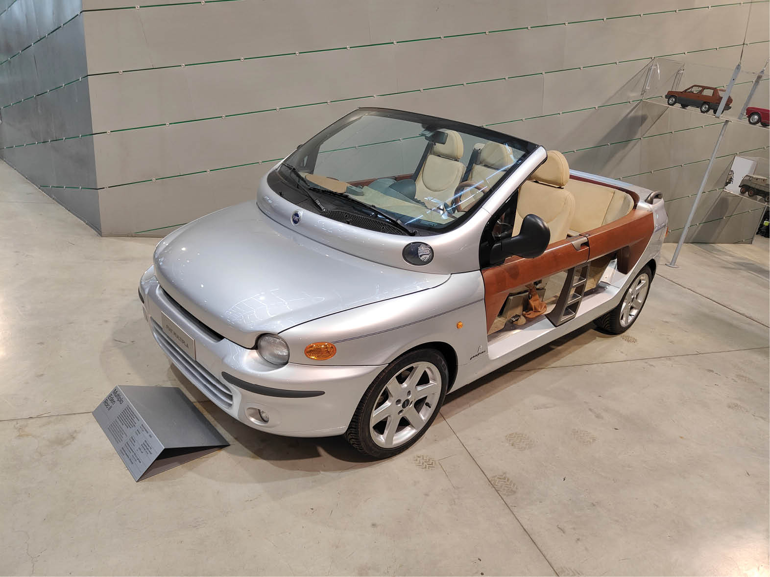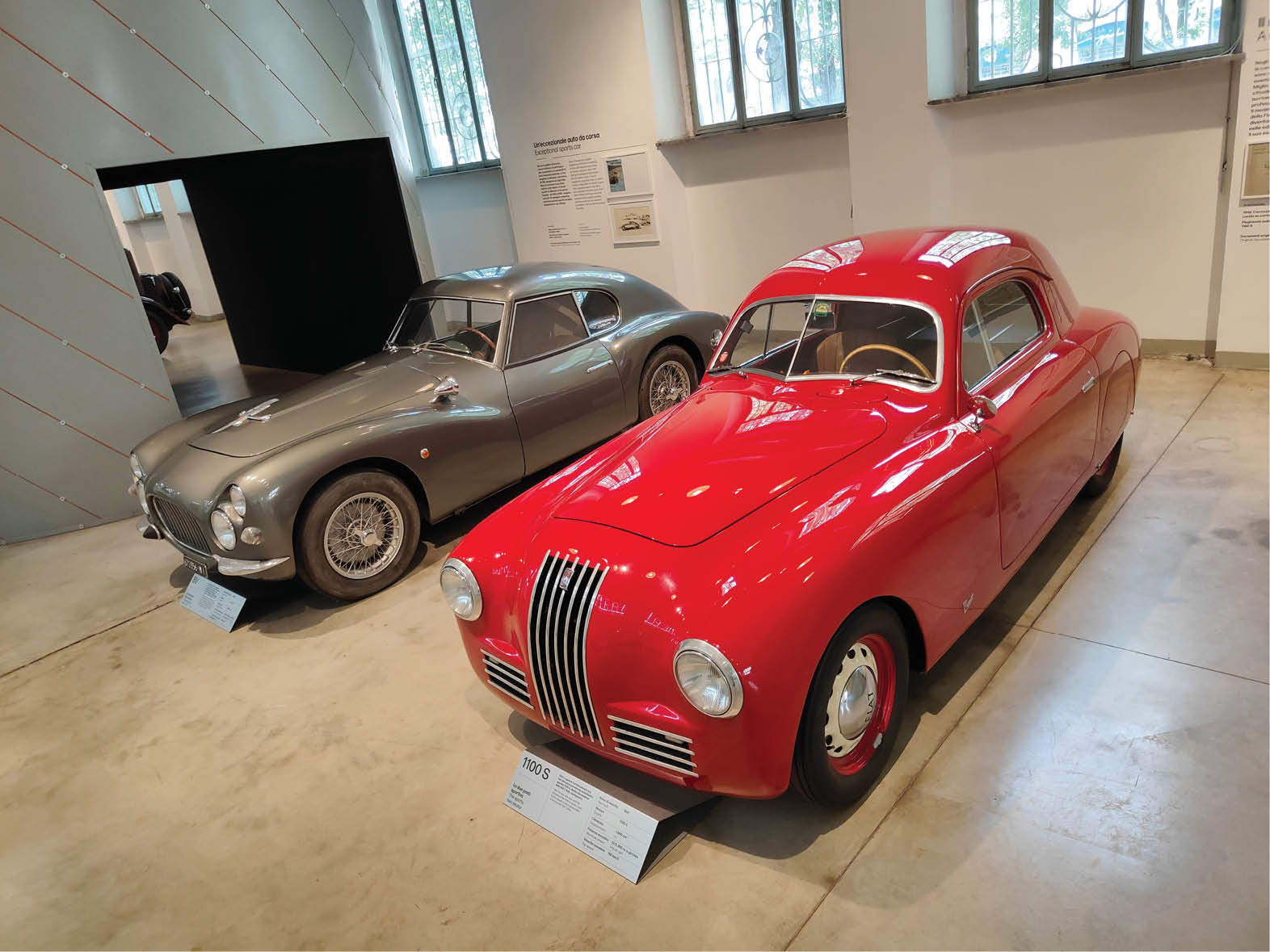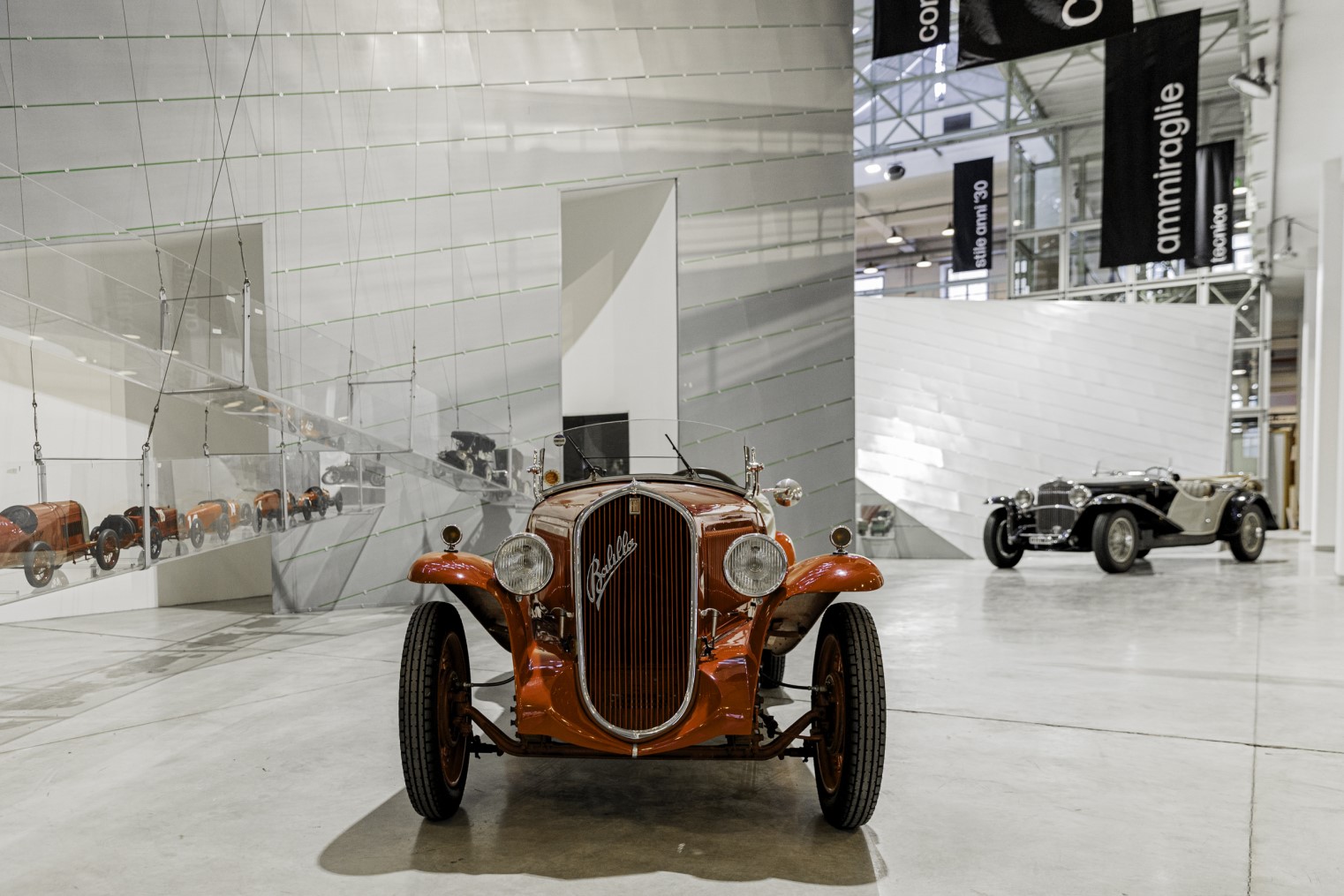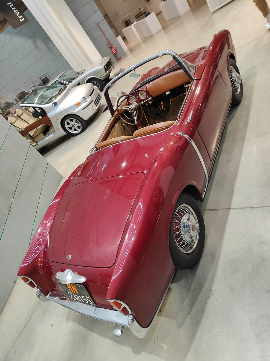 Znacznie bardziej elegancki jest roadster Fiat 525 SS z 1929 r., utrzymany w brytyjskim stylu. Opływowa linia to natomiast cecha wiśniowego Fiata V8 z 1952 r., z nadwoziem z poliestru, projektu Luigiego Rapiego. Pod jedną ze ścian zamontowano fragment dawnej linii produkcyjnej, na której podwieszono surowe nadwozia Fiata 1100, 1400 oraz 124. Tuż obok zaparkował Fiat 1500, który był montowany również w międzywojennej Polsce, a także jedyny w swoim rodzaju prototyp Fiata 700 z 1938 r., popularnego samochodu z nadwoziem z aluminium. Produkcji tego modelu nie uruchomiono ze względu na wybuch wojny.