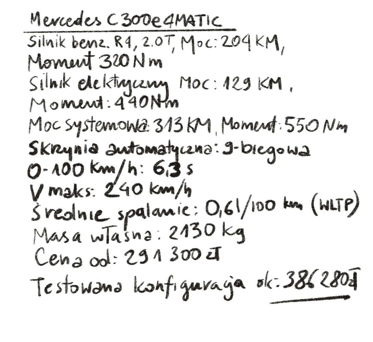 Obok W124 czy W201 nowa klasa C wygląda jak wspomniany już student politechniki wśród profesorów. Wie wszystko o komputerach, zna każdy algorytm, ale brakuje mu tej charyzmy, którą miały dawne Mercedesy – charakterystycznego dźwięku zamykanych drzwi czy gwiazdy na masce jako symbolu statusu. Czy to źle? Niekoniecznie. Przecież każdy ze wspomnianych profesorów kiedyś też był studentem, a czasy się zmieniają. Dziś luksus mierzy się inaczej – ciszą kabiny, szybkością ładowania i liczbą dostępnych aplikacji. Dlatego C 300e jest świetnym samochodem na dziś, a za kilkadziesiąt lat może okazać się, że to właśnie on był początkiem nowego rozdziału. To jedna z najbardziej dopracowanych hybryd plug-in na rynku. Ma realny zasięg elektryczny, szybkie ładowanie, komfort i prestiż marki z gwiazdą. Nie jest autem dla purystów ani fanów sportowych doznań – to raczej cyfrowy asystent niż samochód z duszą. Tyle że dla wielu kierowców to właśnie taka kombinacja technologii i elegancji stanowi dziś najlepszy kompromis. Dodam tylko, że niestety, bardzo kosztowny. O ile samo auto budzi moją sympatię, o tyle jego cena już zdecydowanie nie.