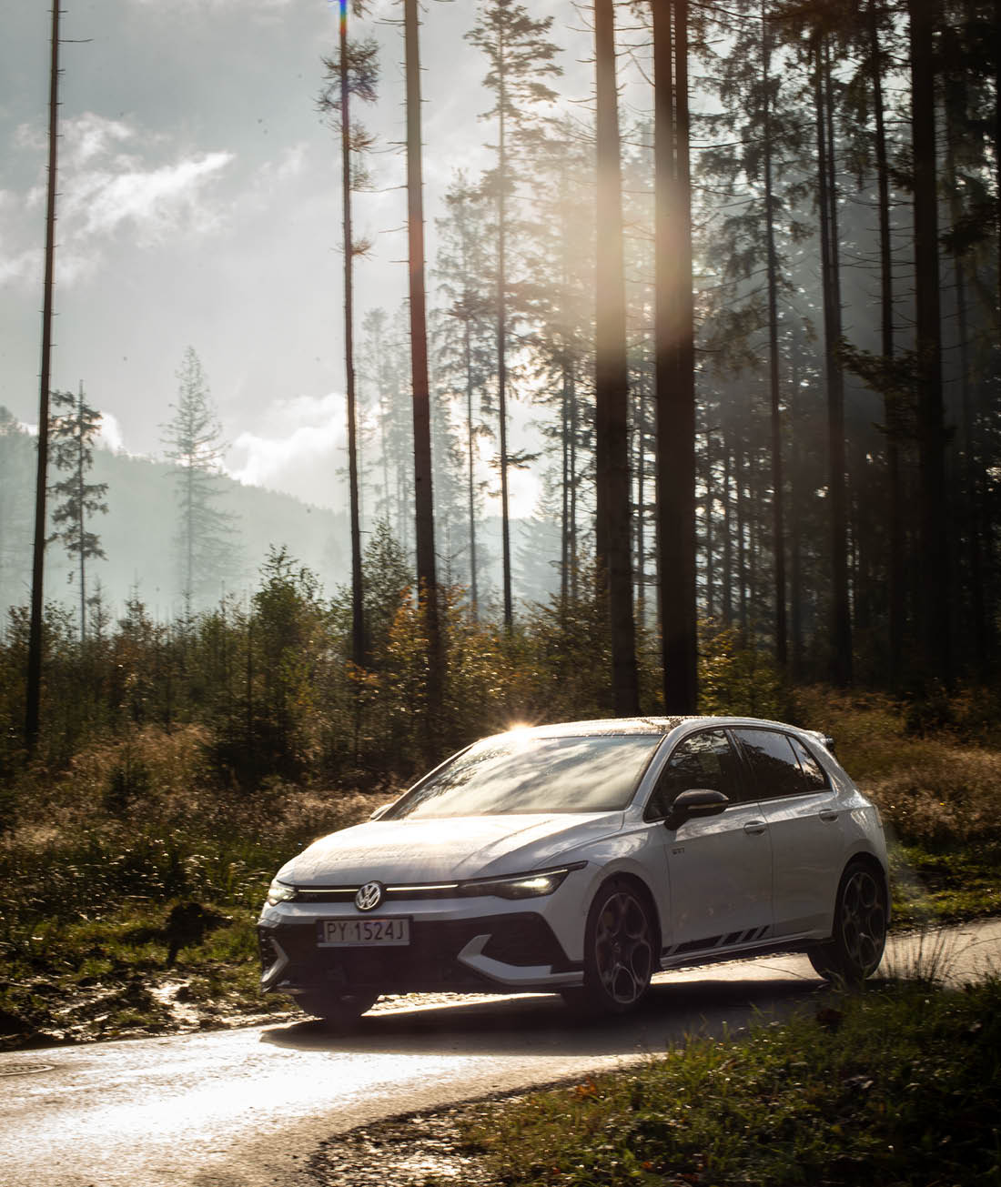 Zostawmy jednak ursynowskie halucynacje z boku. Jest przecież rok 2025, czyli kwintesencja przyszłości. Teraz o dostępności auta dla człowieka świadczy nie jego cena, lecz wysokość raty. A ta w przypadku topowego Golfa GTI Clubsport to nieco ponad 2000 zł netto. I dużo, i mało. Golf GTI to przecież niezawodna kompozycja doskonałej platformy MQB, silnika EA888 i skrzyni DSG 7. Platforma MQB to według tych, co jeżdżą regularnie po Nordschleife – północnej pętli Nürburgringu – najlepsza płyta podłogowa do zabawy na torze. Tak samo silnik – triple eight to wykorzystywany coraz częściej w motosporcie 4-cylindrowy, 2-litrowy „piec”, którego bardzo duży potencjał jest powszechnie znany. MQB, EA888 i DSG 7 to także doskonała kompozycja w wyścigowej klasie TCR.