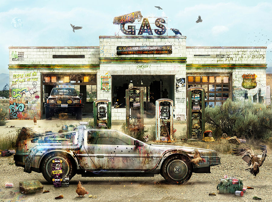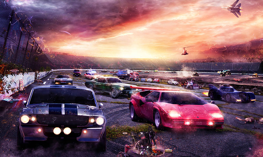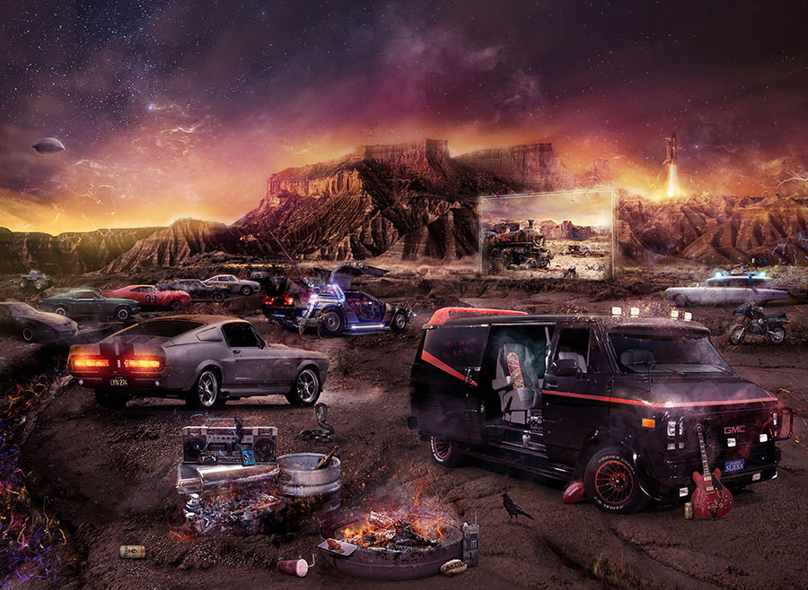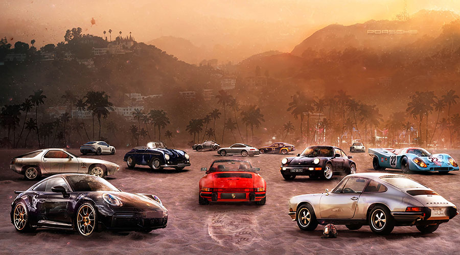 To niejedyny filmowy wehikuł, który trafił na jego cyfrowe płótno. Kultowy Ectomobile z „Pogromców duchów”, Ferrari 250GT California z „Wolnego dnia Ferrisa Buellera” czy cała plejada Porsche – od 356 Speedstera Steve’a McQueena po legendarne Gulf 917 z Le Mans. Wszystkie pojawiły się w jednej z jego najnowszych prac, zatytułowanej „Driven by Dreams”, stworzonej z okazji otwarcia nowego salonu Porsche Centre Cambridge. „Możliwość współpracy z tak wysokiej jakości firmą była dla mnie czymś naturalnym i dałem z siebie wszystko. Zostawiono mi wolną rękę, a fakt, że mogłem wykorzystać wszystkie lata retuszowania dla przemysłu motoryzacyjnego, był ogromną atrakcją. Ważne stało się jednak to, że zamiast przyjmować kliniczne podejście do retuszu, w którym pracujesz zgodnie z formułą, aby osiągnąć spójność i prawdziwą jakość, zawsze starałem się dodawać poczucie magii i emocji w detalach, tak aby wynik nie przypominał pięknego, zainscenizowanego ujęcia w materiale marketingowym. Tło okazało się tak dobre – to połączenie klimatu Hollywood i Miami z cudownie subtelnym detalem ikony marki Porsche – że nie mogłem sobie odmówić zamiany słynnego napisu na wzgórzach nad Los Angeles” – śmieje się Mark.
