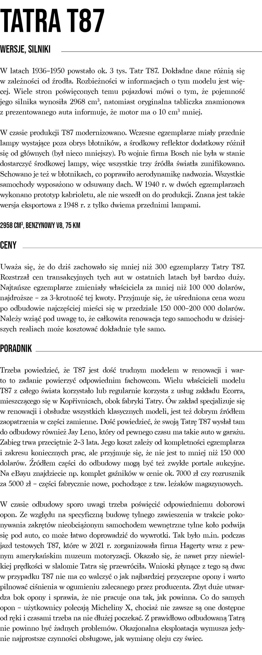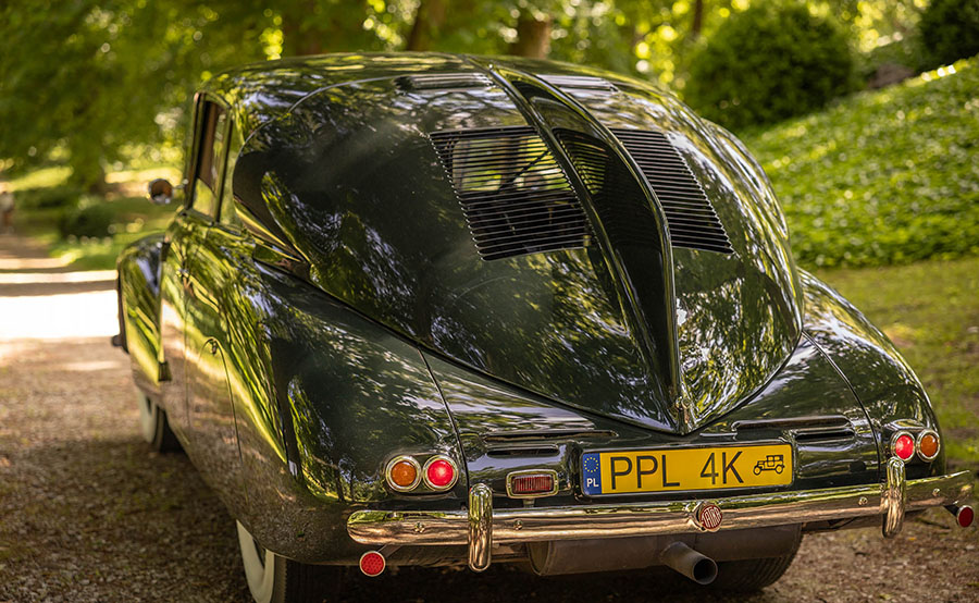 Tatra T87 jako samochód ma też swoje ciemniejsze oblicze, jej losy są bowiem dość mocno powiązane z okresem III Rzeszy. Na liście „celebrytów” użytkujących niegdyś ten wóz znajdują się m.in. Erwin Rommel i Ernst Heinkel, którzy zdecydowanie nie należeli do pacyfistów. Jednym ze znanych właścicieli Tatry był Felix Wankel, który również miał w przeszłości mało chwalebne epizody. Najczęściej jednak wspomina się anegdotę, jakoby niemieccy oficerowie byli tak zahipnotyzowani piłowaniem Tatry na drodze, że rozbijali się na zakrętach i wyprawiali na tamten świat, w następstwie czego sam wódz zakazał im jeżdżenia tymi pojazdami. Jest to oczywiście bajkopisarstwo podobne do drewnianych klocków hamulcowych w rumuńskim Oltcicie czy słynnego niedoszłego bankructwa Mercedesa przez bezawaryjny model W123, niemniej samo trudne prowadzenie to jednak prawda. Nikt nie będzie w stanie lepiej opowiedzieć o narowistym prowadzeniu Tatry niż sam właściciel. Przypomnijmy, że samochód w latach 30. szczycił się opinią jednego z najszybszych na ówczesnych drogach, gdyż rozwijał maksymalnie niemal 160 km/h. „Tatra na prostej jest prawdziwym pociskiem, bez problemu osiągnąłem nią na trasie prędkość 120 km/h. Czułem, że to nie koniec i pod prawą stopą mam jeszcze ogromny zapas, ale szybciej jechać już się jednak bałem, ponieważ Tatra przy tej prędkości była bardzo niestabilna” – tłumaczy nasz rozmówca. A co z niebezpiecznym prowadzeniem w zakrętach? „Zdarzyło mi się uczestniczyć w imprezach organizowanych na torze w Poznaniu, podczas których według historycznych zasad wyścigu Le Mans na sygnał wystrzału z pistoletu biegnie się do samochodów, wsiada, uruchamia motor i wyjeżdża na trasę. Kiedyś wystartowałem w tej imprezie Tatrą i pomimo że było to jedno z najmocniejszych aut w stawce, dojechałem do mety… przedostatni. Jest to samochód bardzo trudny w prowadzeniu przez skumulowanie większości masy z tyłu. Przy dużych prędkościach Tatra potrafi być bardzo nadsterowna i trudna do opanowania, cały pojazd aż wibruje” – zaznacza właściciel i dodaje zarazem, że o wiele lepiej do takiej zabawy nadaje się BMW, które prowadzi się doskonale i raz udało się nawet wywalczyć za jego kierownicą miejsce na podium.