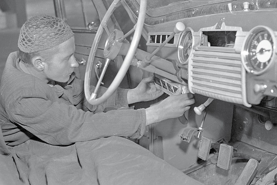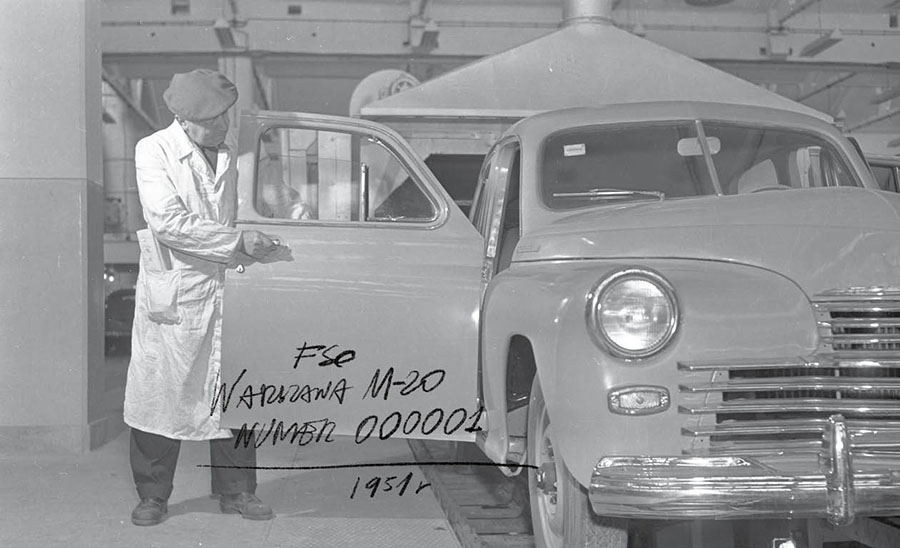 Tu warto się na chwilę pochylić nad tymi słowami. Warszawa nr 000001 nie powstała z polskich części, ale też nie dotarła gotowa z ZSRR, jak głosi jedna z legend. A to dlatego, że… nie była najstarsza! Sylwetka „garbuski” już od 24 grudnia 1950 r. zaczęła pojawiać się na stołecznych ulicach za sprawą zamówienia 100 egzemplarzy Pobiedy M20 przez właśnie tworzone Miejskie Przedsiębiorstwo Taksówkowe w Warszawie. Wozy były charakterystyczne dzięki dwukolorowemu malowaniu – jasnoszary na ciemnoszarym. Jeździły nieustannie, więc robiło to wrażenie, jakby w mieście było ich o wiele więcej. Pierwsze Warszawy M-20 zmontowane w FSO dołączyły do nich na całe tygodnie przed oficjalną premierą. Były fantomami do nauki. Składano je mozolnie, ucząc się na błędach, po czym częściowo rozkładano ponownie. Kompletowano je z zestawów części dostarczanych w drewnianych skrzyniach z Gorkiego. Otrzymywały znaczek FSO na pokrywie silnika, kołpaki kół z napisem „FSO”, podobnie ozdobiony klakson w osi kierownicy, emblematy „Warszawa” na bokach pokrywy silnika, okazałą plakietę „Fabryka Samochodów Osobowych” pośrodku deski rozdzielczej i małą „Licencja ZSRR” na pokrywie schowka. W ferworze ktoś chyba zapomniał o spolonizowaniu odlewanego bumerangu-rakiety na masce. Mozolnie szlifując, usuwano z niego głęboki napis „GAZ”, po czym doraźnie montowano polerowaną blaszkę z napisem „FSO”. Przedprodukcyjne egzemplarze w końcu opuściły fabrykę, ale najprawdopodobniej dostały numery seryjne późniejsze od nominalnie pierwszych pięciu sztuk. Te zostały złożone na samym końcu, tak by zminimalizować ryzyko blamażu podczas uroczystości. Świadkowie tego wydarzenia uznaliby to zapewne za „zdradziecki atak imperialistycznych szpiegów na bohaterską załogę Żerania”, ale i tak ktoś z FSO mógłby skończyć na Rakowieckiej. W dwutygodniku „Stolica. Ilustrowana kronika budowy Warszawy” z połowy października 1951 r. tak opisano – w stylu audycji radiowej – przygotowania do produkcji (pisownia oryginalna): „Oto pierwsza hala, potężny budynek całkowicie już ukończony. Wewnątrz hali montuje się obecnie urządzenia i maszyny. Wchodzimy do wnętrza hali, a raczej do pierwszej jej części, gdzie znajdują się taśmy montażowe. Pierwszy konwojer powoli posuwa się naprzód, niosąc częściowo zmontowane podwozie samochodu. W międzyczasie dochodzi przedni i tylny most. Na drugim 2-taśmowym konwojerze samochód otrzymuje pozostałe części. Wóz zjeżdża następnie na konwojer podłogowy. Motor już warczy. Bada się tu sprawność sprzęgieł i gaźnika, sprawdza się regulację kół i wreszcie samochód wyjeżdża przed bramę. Nie na długo jednak. To tylko krótka przejażdżka na torze próbnym, której celem jest wykazanie ewentualnych usterek w montażu wozu. Po próbie samochód wraca przed bramę na doły rewizyjne”. Przed premierą fabryka miała zgromadzony zapas części, który pozwalał złożyć wielką liczbę egzemplarzy. Do końca 1951 r. wyjechało z niej jednak tylko 70. Radziecka technologia była staromodnie rzemieślnicza, niezwykle materiało- i czasochłonna. Na karoseriach nie szczędzono wypełniacza cynowo-ołowiowego, wiele części wykonywano na prostych obrabiarkach. Fabryka miała symboliczną liczbę kooperantów, którzy dostarczali np. odlewy żeliwne, odkuwki stalowe, opony, szyby, uszczelki, akumulatory i części elektryczne. Takie ograniczenia sprawiły, że montaż jednego samochodu wymagał 240 roboczogodzin. W tamtych czasach Fiat składał auta niemal o połowę szybciej. Żerań nie miał nowoczesnej organizacji produkcji, chociaż gazety oczywiście uczyniły z tego ogromną zaletę. Wychwalały, że FSO jest wspaniale samowystarczalna, że wytwarza na miejscu wszystkie części, nawet śrubki.