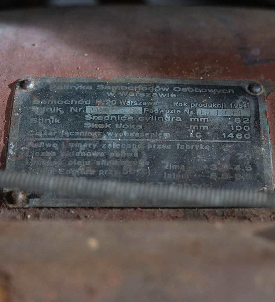 Budząca tyle emocji tabliczka znamionowa FSO z rocznikiem 1951 i numerem 000001 na wnęce błotnika nie nosi śladów demontażu. Nie udało się jeszcze odczytać numeru jednostki napędowej. Spodziewamy się, że będzie dość wysoki, bo to przecież produkt zakładów GAZ, na większą skalę wytwarzany od wiosny 1947 r. W komorze silnika tkwi radziecki regulator napięcia prądnicy. Odstępstwem od oryginału jest polski gaźnik G-35 z pasującym do niego filtrem powietrza. Była to częsta modernizacja z epoki, służąca oszczędności benzyny. Warszawę poza fabryką lakierowano dwukrotnie, najpierw na kolor popielaty, a potem na czekoladopodobny. Podczas remontu fińscy blacharze i lakiernicy nie trzymali się ściśle oryginału – znaczek M-20 na masce przytwierdzili za wysoko. Tworzywa sztuczne z dodatkiem mączki kostnej użyte w kabinie są fantazyjnie pokrzywione wskutek procesu naturalnego rozkładu i zmian temperatury, co jest typowe dla ówczesnych GAZ-ów i Moskwiczów. Fotele przykryto podartymi już pokrowcami, które częściowo ochroniły fabryczną tapicerkę. Inne niż te ze znanych nam Warszaw szybkościomierz i wskaźniki mają czcionkę jak w Pobiedzie, ale polskie napisy. Cyferblaty lśnią mosiądzem z lekką czerwoną poświatą. Mają jeszcze do opowiedzenia wiele wspomnień, do których staramy się dotrzeć. Ta historia przez cały czas nie jest jeszcze kompletna, ale nie kończymy naszych badań. Potraktujcie to raczej jako jej pierwszy, nowy rozdział. Warszawa nr 000001 jeszcze nas na pewno zaskoczy.