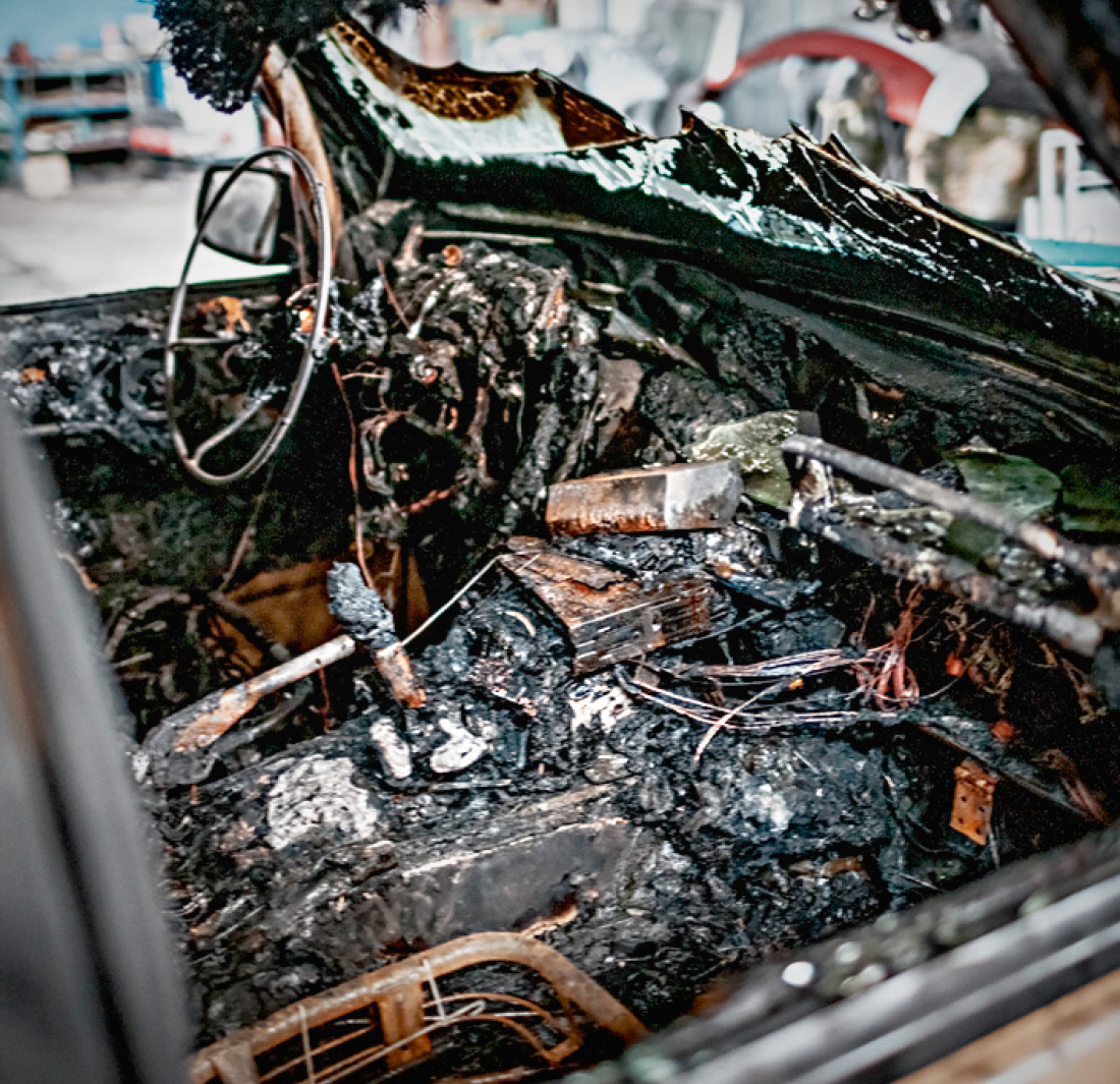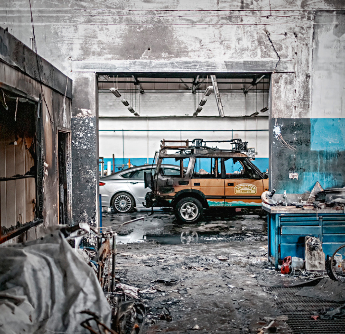 W grudniu 2016 r. w gdańskiej hali Polmozbytu, gdzie wynajmowaliśmy przestrzeń na nasz serwis Land Roverów, wybuchł pożar. W zasadzie cała hala została spalona lub zawaliła się podczas akcji gaśniczej. Stojący tam wtedy Discovery z Camel Trophy cudem przetrwał, zostając z kompletnie spalonym wnętrzem i nienaruszoną komorą silnika. Mocno oberwał także tył pojazdu.