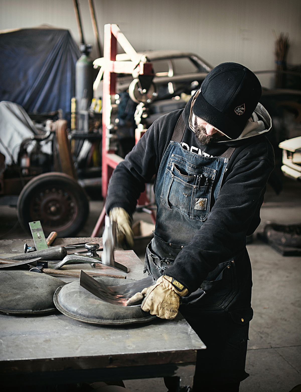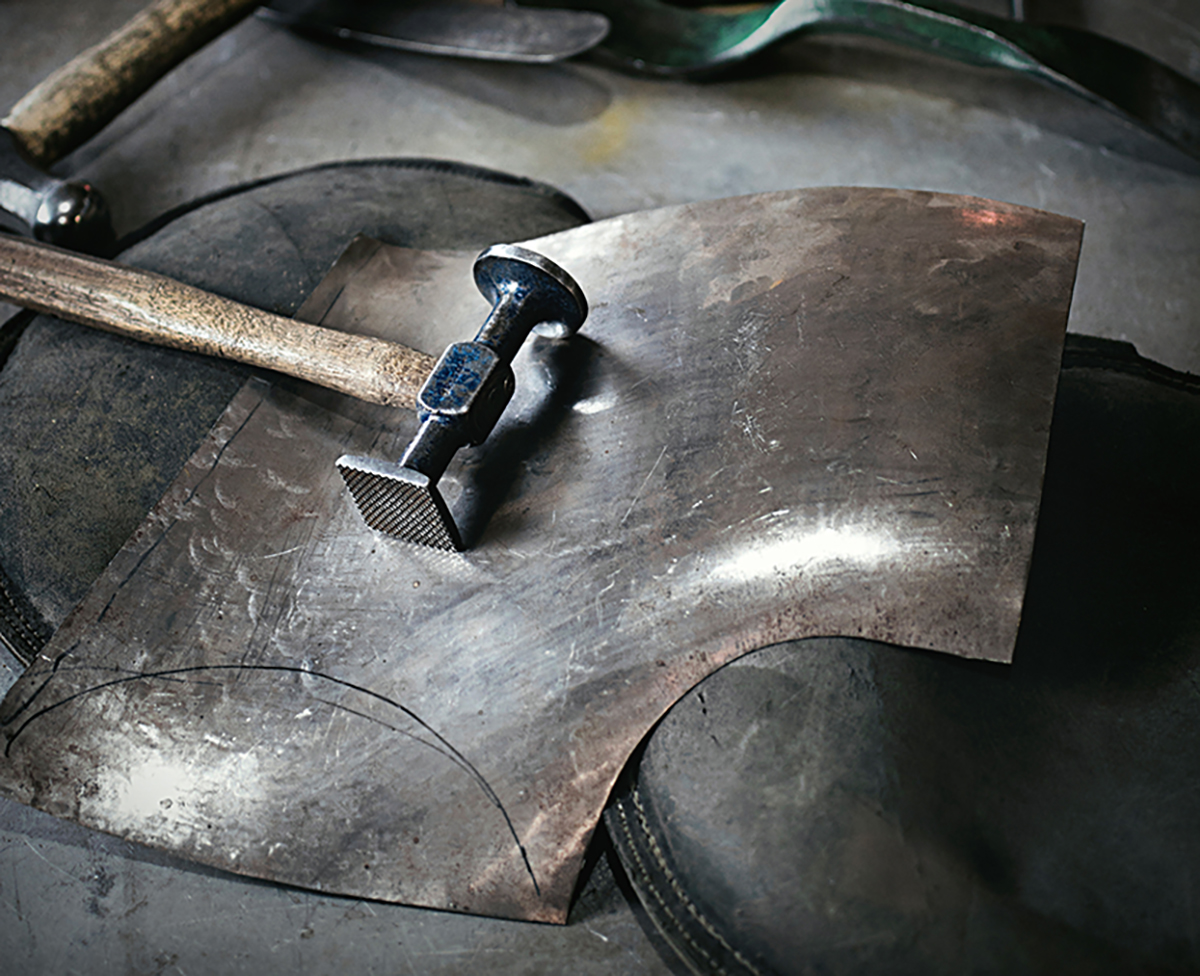 Jak powstają takie elementy? Najpierw trzeba spokojnie postać, popatrzeć, pozastanawiać się, wypalić papierosa i wybrać odpowiednią drogę. Następnie wyznaczyć obszar naprawy i zrobić szablon. Czasem jest on naprawdę skomplikowany, z tektury, taśmy papierowej i taśmy zbrojonej. Potem zaczyna się zabawa. Wycinasz płaską blachę i oceniasz głębokość kształtu – albo na młotek i worek z piaskiem, albo od razu koło angielskie. Jak już jest rozciągnięta i spęczona, gdzie trzeba, przechodzi się do żłobień i przetłoczeń. Niektóre rzeczy robi się ręcznie, niektóre maszynami. Przyspieszają one prace, co jest ważne dla klienta, który przecież płaci za godzinę pracy Jakuba. Na końcu nastaje najsmutniejszy moment, czyli lakierowanie. Cała praca blacharza znika pod barwną powłoką.
