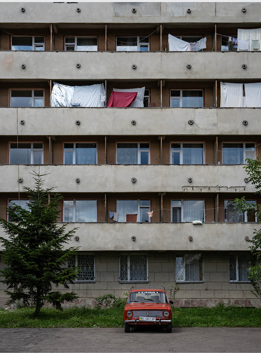 Podobną procedurę musiałem przejść w sanatorium Dzerelo, żeby zobaczyć mozaikę zdobiącą jedną ze ścian krytej pływalni. Godziny załatwiania, rozmawiania, chodzenia między pokojami, żeby potem przez 15 minut zrobić kilka zdjęć basenu ze spuszczoną wodą. Brzmi jak opis straconego czasu, ale to tylko pozory. W końcu to też jest element postsowieckiej tożsamości, dziedzictwo kulturowe ery niekończących się procedur i wymagania pozwoleń vel kwitów na każdą niemal okoliczność. Takie załatwianie spraw idealnie uzupełnia doświadczenie, którym jest znalezienie się w strefie wpływów byłego Sojuzu. Dlatego też nie mogłem nie sfotografować czerwonej Łady stojącej na tle smutnego szarego bloku z praniem wywieszonym na balkonach, czy też charakterystycznego wagonu kolejowego czekającego na odjazd z głównego dworca w Truskawcu. To także są elementy radzieckiej popkultury. Wciąż obecne, ale wraz z upływem czasu znikają w zastraszającym tempie. Dlatego mimo wojny i całego ryzyka z nią związanego będę wracać do Ukrainy. I to nie raz.